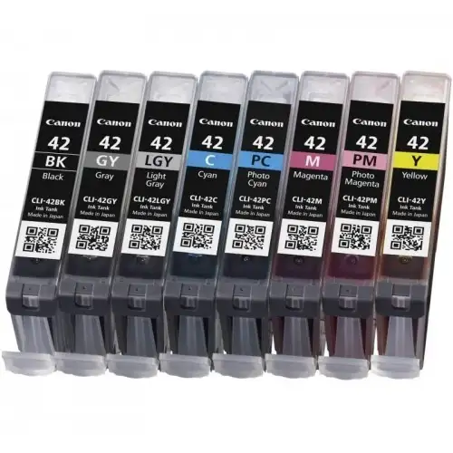 Canon CLI-42 BK/C/M/Y/PM/PC/GY/LGY. Tüüp: Originaal, Tindi tüüp: Dye-based ink / Pigment-based ink, Printimisvärvid: Must, Tsüaan, Hall, Helehall, Magenta, Fototsüaan, Fotomagenta, Kollane. Pakendi tüüp: Blisterpakend. Leheküljetootluse lisamärkus: 10x15cm, ISO/IEC 24734