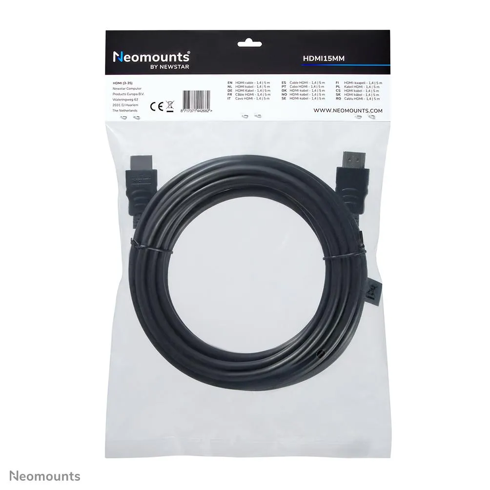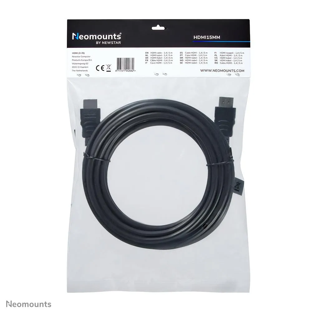 Neomounts HDMI15MM. Kaabli pikkus: 5 m, Pistmik 1: HDMI tüüp A (Standard), Konnektor 1 sugu: Meessoost, Pistmik 2: HDMI tüüp A (Standard), Konnektor 2 sugu: Meessoost, HDMI-versioon: 1.3, Andmeedastuskiirus: 10,2 Gbit/s, Toote värv: Must