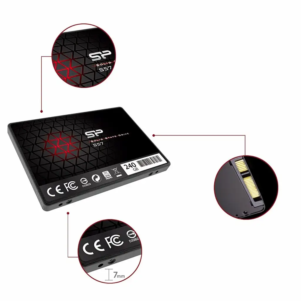 Silicon Power Slim S57. Pooljuhtketta maht: 240 GB. SSD-ketta mõõtmed: 2.5". Pooljuhtketta liides: Jada ATA III, Andmeedastuskiirus: 6 Gbit/s, Komponent: Sülearvuti