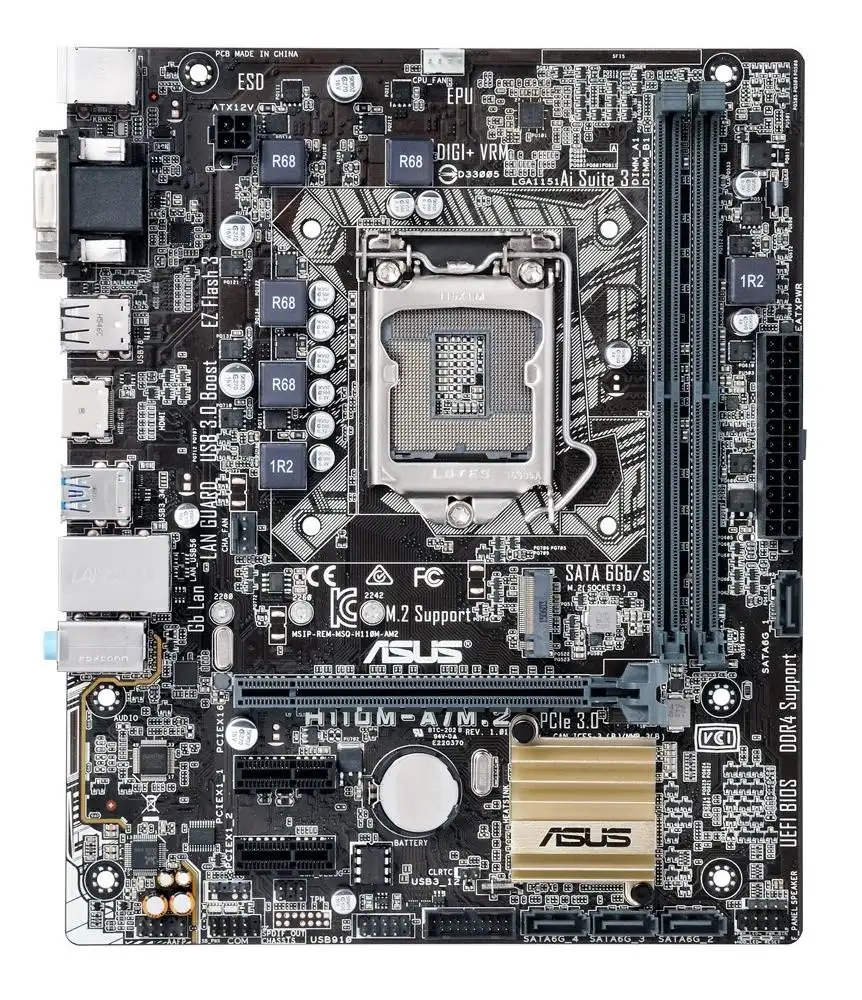 ASUS H110M-A/M.2. Protsessori tootja: Intel, Protsessori pesa: LGA 1151 (pesa H4), Ühilduvad protsessoriseeriad: Intel® Celeron®, Intel® Pentium®. Toetatud mälutüübid: DDR4-SDRAM, Mälupesa tüüp: DIMM, Toetatud mälu taktsagedused: 2133 MHz. Kõvaketta ühenduse tüüp: M.2, Jada ATA III. LAN-kontroller: Intel I218V. Komponent: PC, Emaplaadi kujutegur: Mikro ATX, Emaplaadi kiibistik: Intel