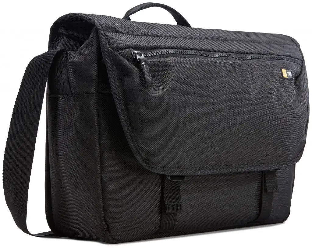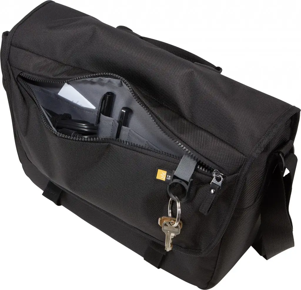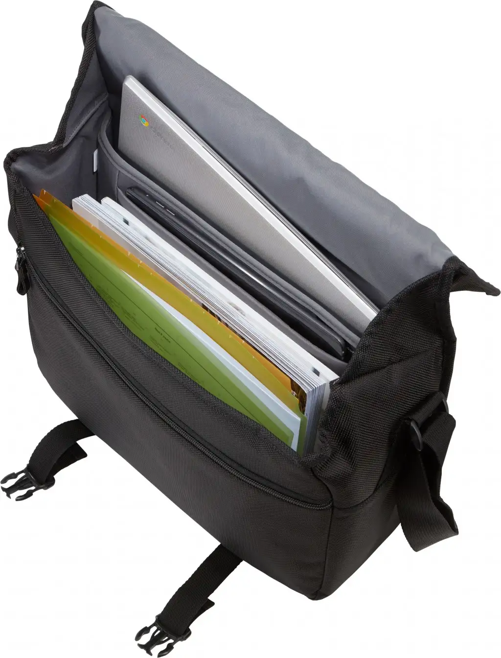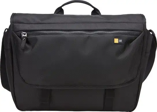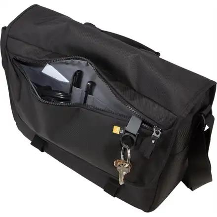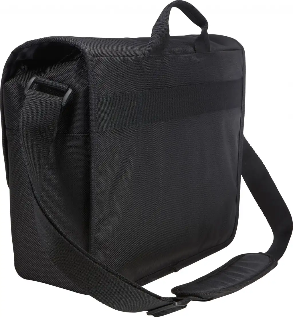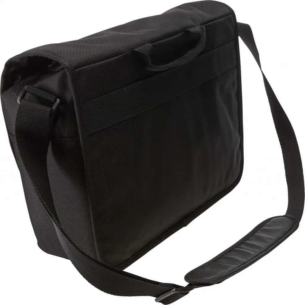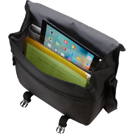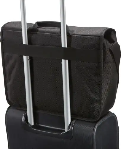 Padded laptop compartment for a 15" MacBook Pro® or laptops with up to a 14" display, Protective iPad® or 10.1” tablet storage, Luggage strap securely attaches messenger bag to most rolling luggage
