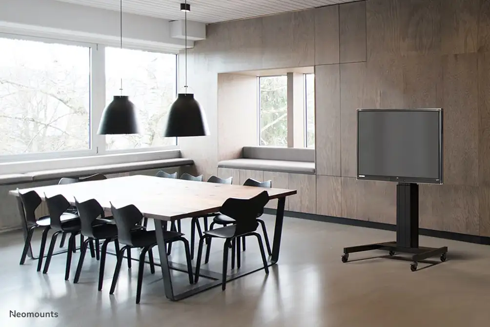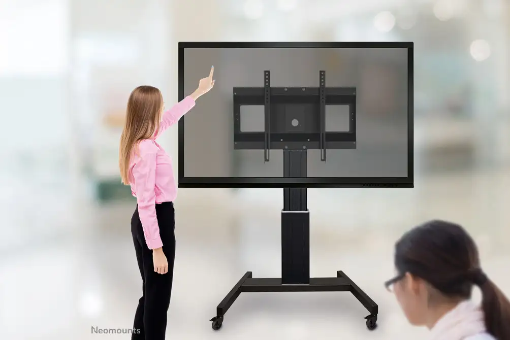 With the Neomounts by Newstar PLASMA-M2500BLACK automatic height adjustable floor stand you place a large format flat screen on the floor. Get optimal positioning for both standing and seated audiences, in any application, in any part of your location. Perfect to use in a class room, boardroom, presentation room or public entrance. The PLASMA-M2500BLACK is suited for screens between 42" - 100" and has a load capacity of 150 kg. The trolley is suitable for screens with a VESA hole pattern of 200x200, 200x400, 400x400, 400x600 to 600x800 mm. Behind the screen is a 6 cm deep space available to mount a media player or mini-computer. Cables can be guided at the back of the mount. Easily roll this cart over doorways and thresholds with to the high quality wheels. The mobile electric floor lift is automatically height adjustable over a height of 50 cm with a remote control. From the floor to the center the distance of the screen is variable from 111 cm to 161 cm. The Neomounts by Newstar PLASMA-M2500BLACK comes in a black RAL 9005 color and is a great choice for space saving placement or when wall-, ceiling mounting or desk placement is not an option. All installation material is included with the product.