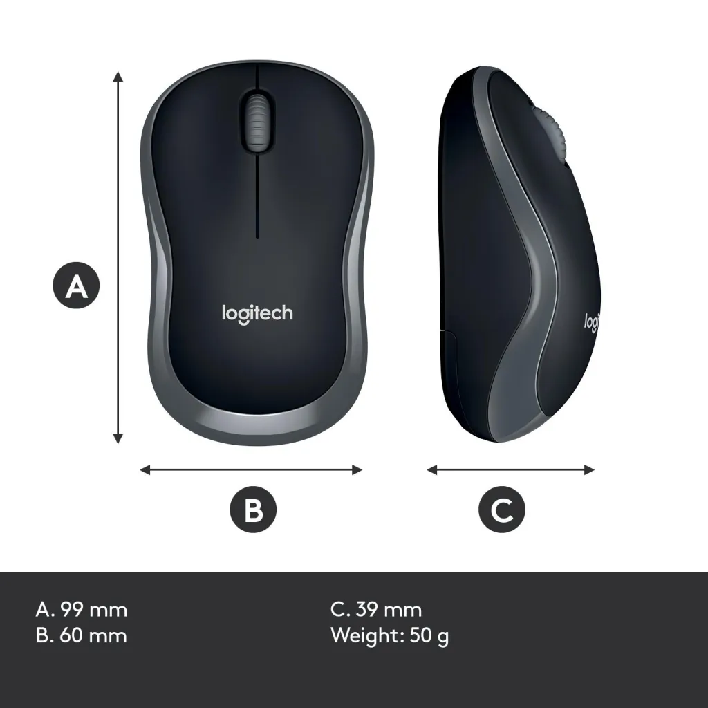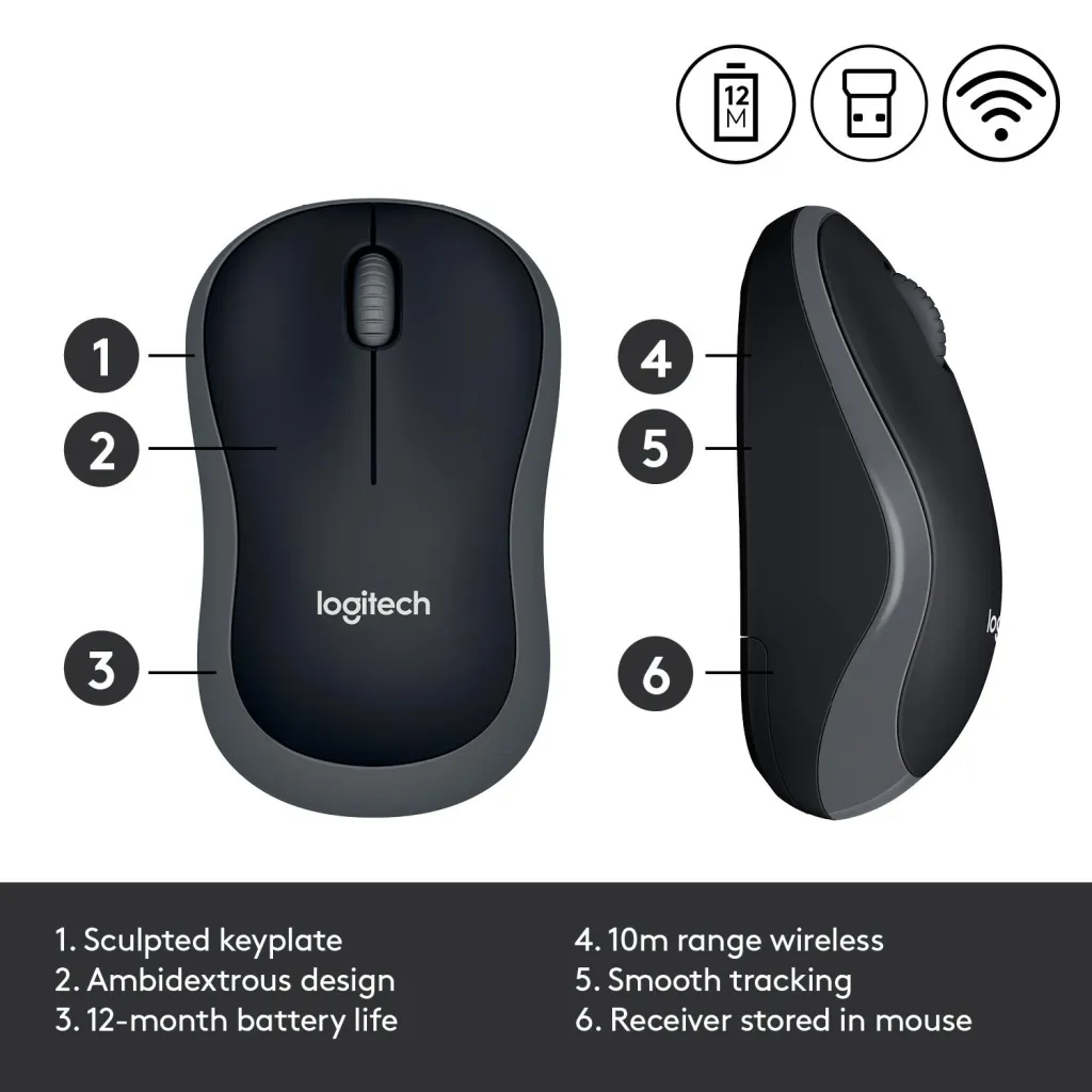 | Summary | Logitech Wireless Mouse M185. Form factor: Ambidextrous. Movement detection technology: Optical, Device interface: RF Wireless, Movement resolution: 1000 DPI, Buttons type: Pressed buttons, Buttons quantity: 2, Scroll type: Wheel. Power source: Batteries. Product colour: Grey |