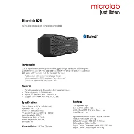 | Special features | Rugged design, perfect for outdoor sports. Waterproof rating IPX4, shockproof and dustproof. Built-in microphone for hands free calls. FM radio. |