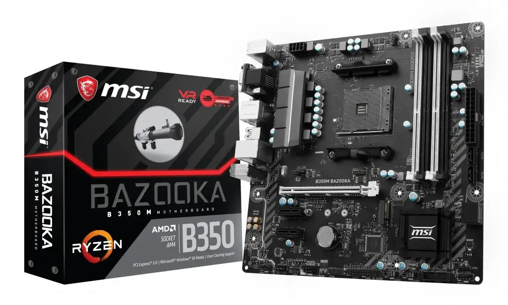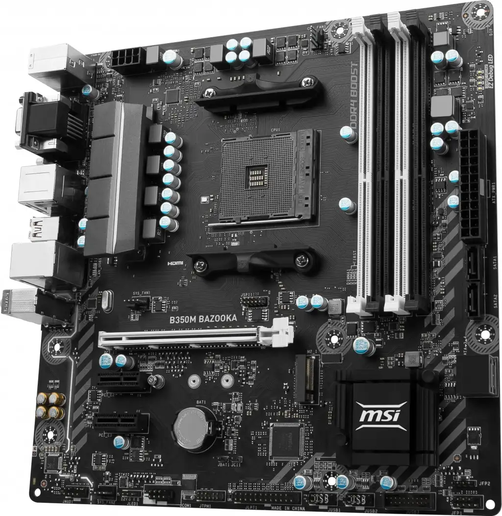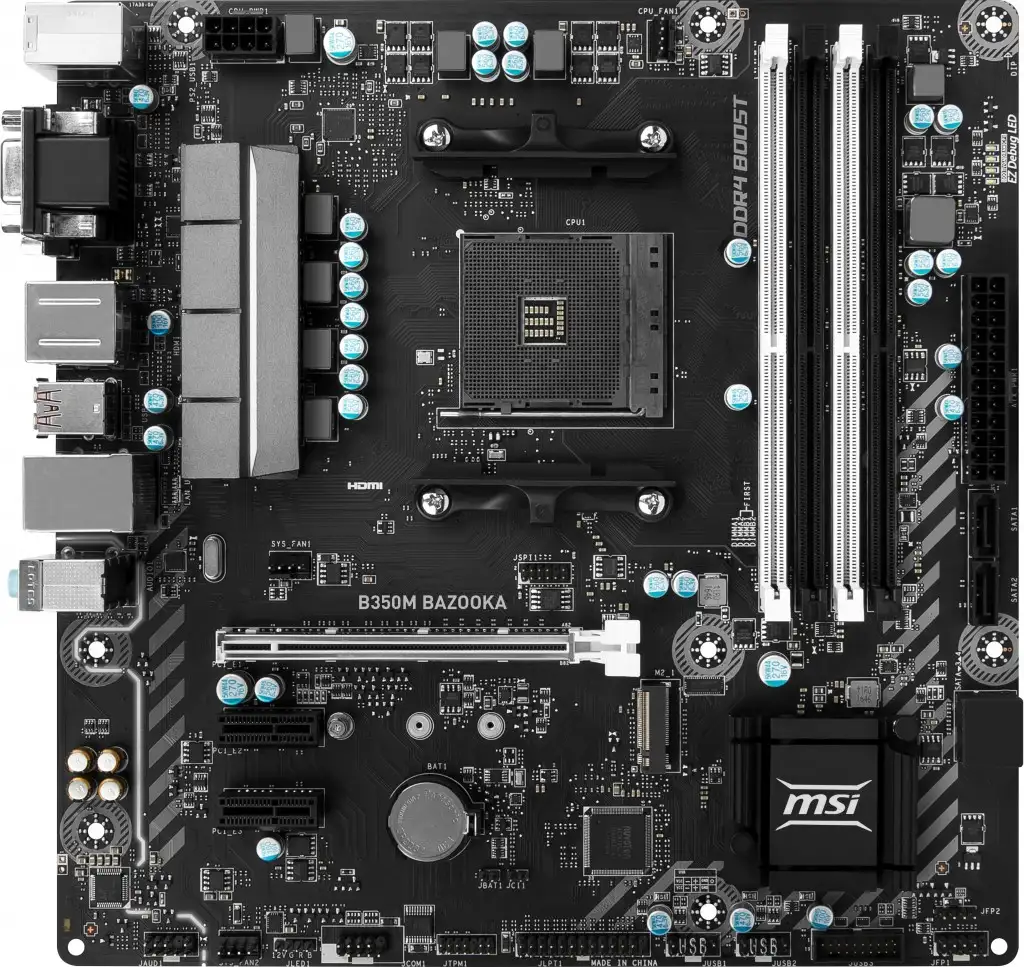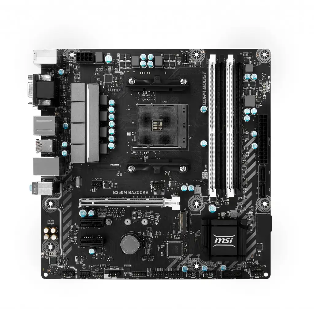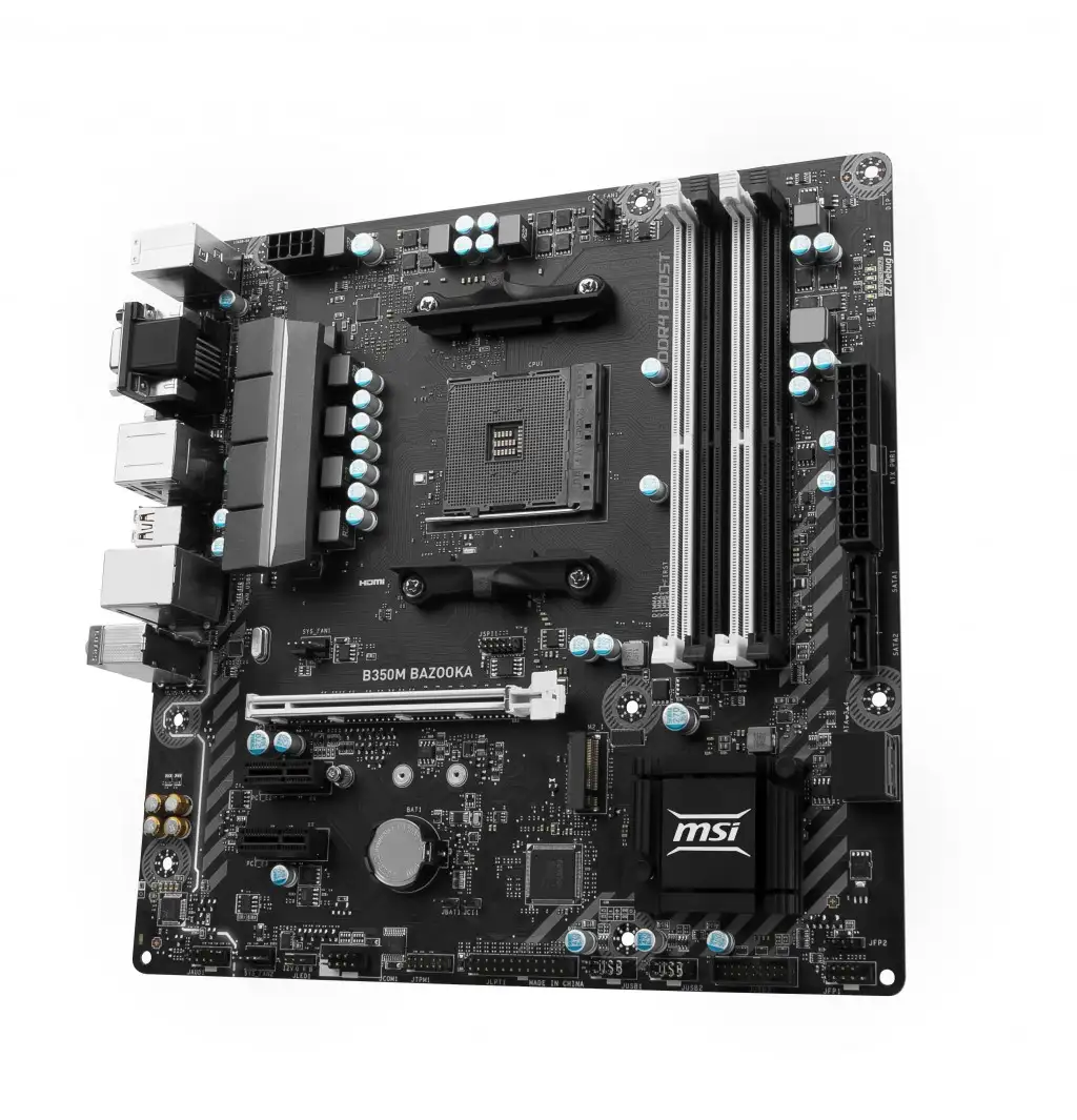 MSI B350M BAZOOKA. Toetatud mälutüübid: DDR4-SDRAM, Mälupesa tüüp: DIMM, Toetatud mälu taktsagedused: 1866,2133,2400,2667,2933,3200 MHz. Protsessori tootja: AMD, Ühilduvad protsessoriseeriad: AMD A,AMD Ryzen, Protsessori pesa: Pesa AM4. Toetatud ketaste tüübid: HDD, SSD, RAID-tasemed: 0, 1, 10. Ethernet-liidese tüüp: Kiire Ethernet, Gigabit Ethernet, LAN-kontroller: Realtek RTL8111H. Komponent: PC, Emaplaadi kiibistik: AMD, Emaplaadi kiip: AMD B350