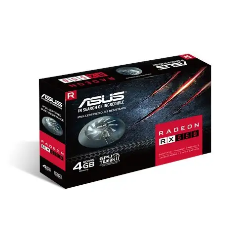 ASUS Radeon RX 550 4G GDDR5. Graafikaprotsessorite pere: AMD, Graafikaprotsessor: Radeon RX 550. Eraldiseisva graafikakaardi mälu: 4 GB, Graafikaadapteri mälutüüp: GDDR5, Mälusiin: 128 bitti, Mälu taktsagedus: 7000 MHz. Maksimaalne resolutsioon: 5120 x 2880 pikslit. DirectX-i versioon: 12.0, OpenGL-i versioon: 4.5. Liidese tüüp: PCI 3.0. Jahutuse tüüp: Aktiivne, Ventilaatorite arv: 1 ventilaator(id)