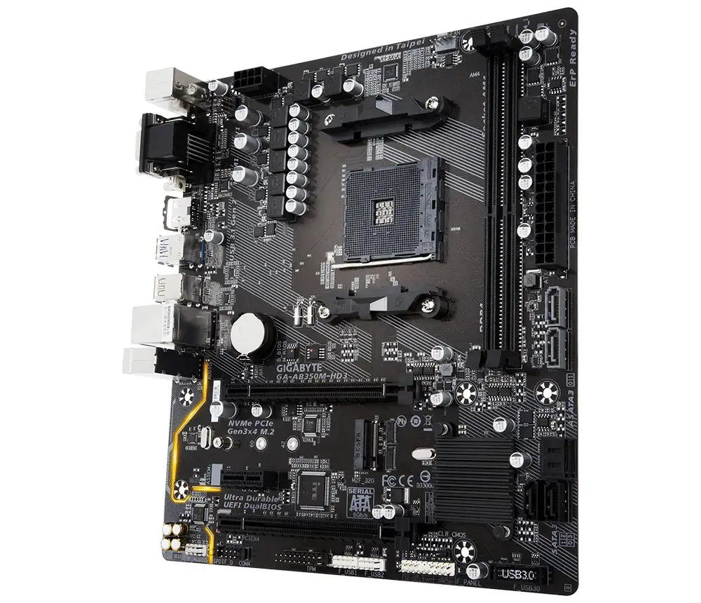 Gigabyte GA-AB350M-HD3. Toetatud mälutüübid: DDR4-SDRAM, Mälupesa tüüp: DIMM, Toetatud mälu taktsagedused: 2133,2667,2933,3200 MHz. Protsessori tootja: AMD, Ühilduvad protsessoriseeriad: AMD A,AMD Ryzen, Protsessori pesa: Socket AM4. RAID-tasemed: 0, 1, 10. Kõvaketta ühenduse tüüp: M.2, PCI Express, Jada ATA III. Ethernet-liidese tüüp: Gigabit Ethernet