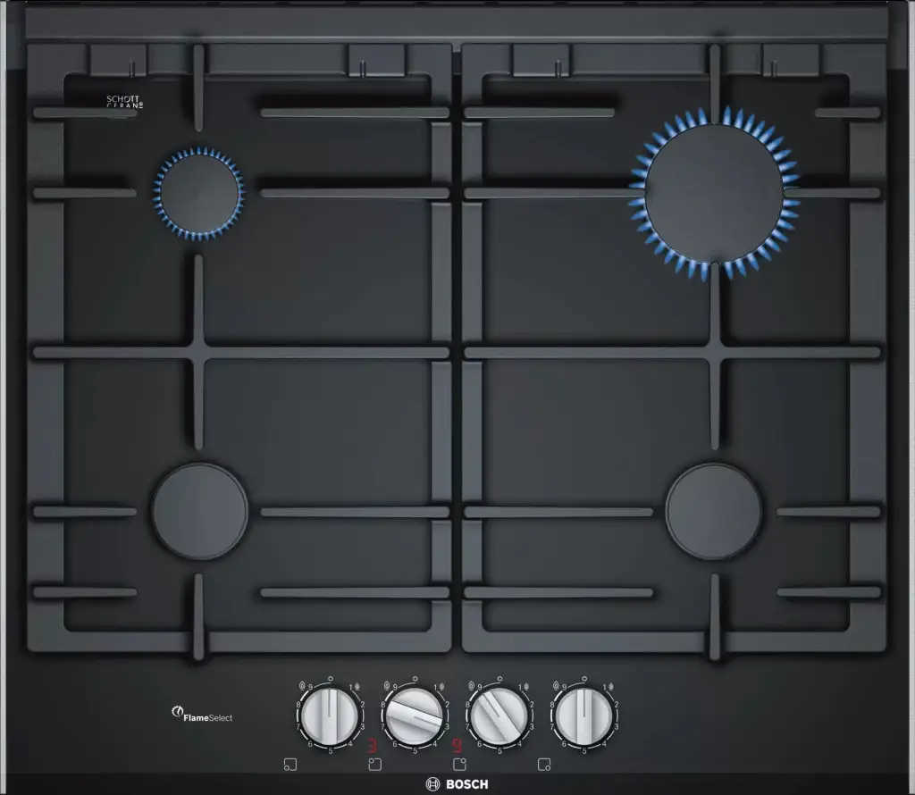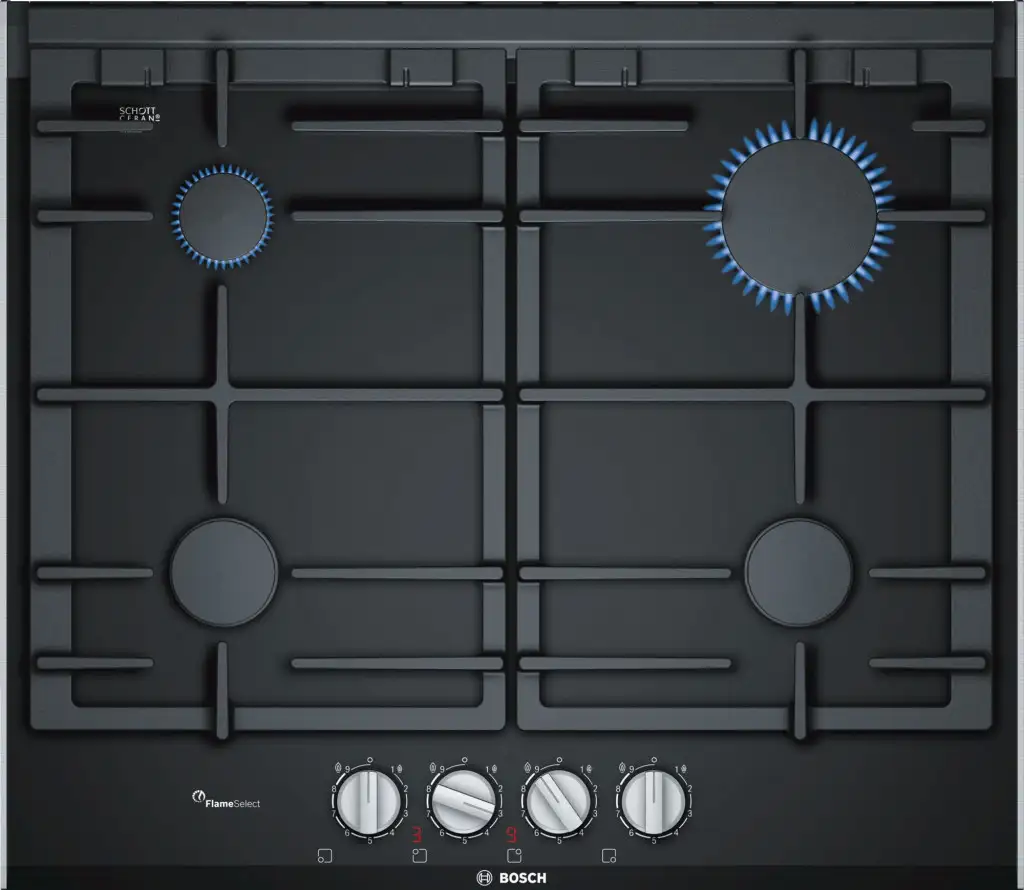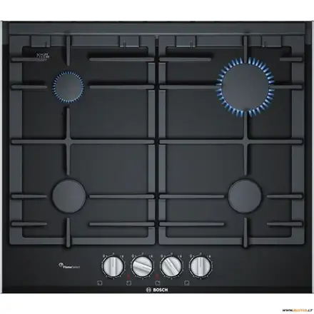 Bosch Serie 8 PRP6A6D70. Toote värv: Must, Roostevaba teras, Seadme paigaldus: Sisseehitatud, Pliidiraua tüüp: Gaas. Sertifikaat: CE. Kontrolli tüüp: Pöörlev, Juhtimise paigutus: Esikülje ülaosa. Ühendatud koormus (elekter): 2 W, Ühendatud koormus (gaas): 7700 W, AC-sisendpinge: 220 - 240 V. Laius: 606 mm, Sügavus: 527 mm, Kõrgus: 45 mm