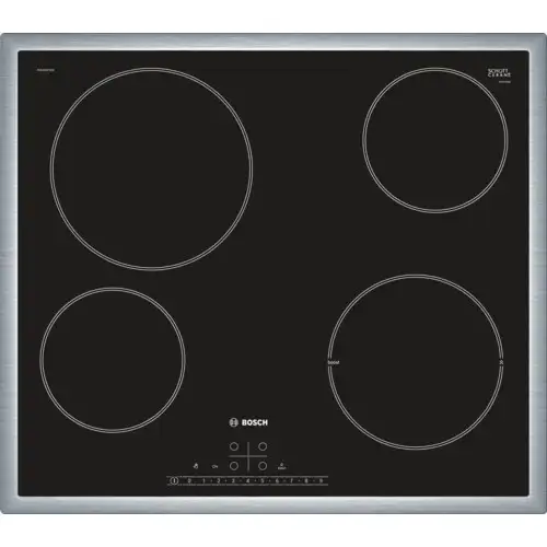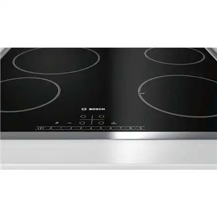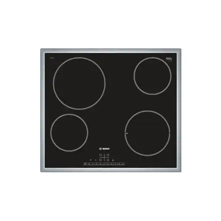 Bosch Serie 6 PKE645FN1E. Toote värv: Must, Seadme paigaldus: Sisseehitatud, Pliidiraua tüüp: Keraamiline. Sertifikaat: CE, VDE. Kontrolli tüüp: Puudutus, Juhtimise paigutus: Esikülje ülaosa. Ühendatud koormus (elekter): 6900 W, AC-sisendpinge: 220-240 V, AC-sisendsagedus: 50 - 60 Hz. Laius: 583 mm, Sügavus: 513 mm, Kõrgus: 48 mm