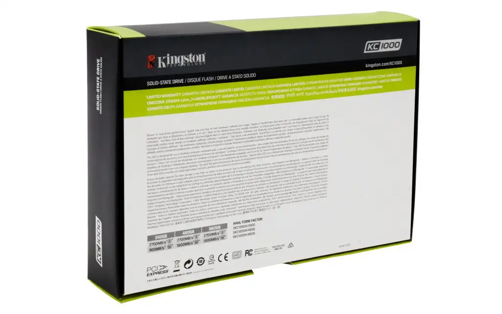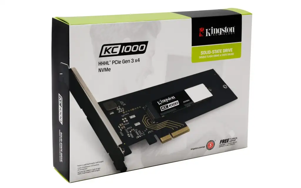 Kingston Technology KC1000 NVMe PCIe SSD 960GB, HHHL. Pooljuhtketta maht: 960 GB, Pooljuhtketta liides: PCI Express 3.0, Lugemise kiirus: 2700 MB/s. SSD-ketta mõõtmed: HHHL (CEM2.0), Toote värv: Must, Sertifikaat: FCC, VCI. Võimsustarve (lugemisel): 4,95 W, Võimsustarve (kirjutamisel): 7,4 W, Võimsustarve (jõudeajal): 0,11 W. Laius: 121 mm, Sügavus: 181 mm, Kõrgus: 21,6 mm. Pakendi tüüp: Karp