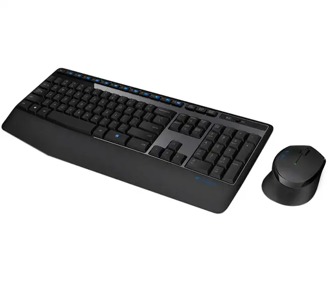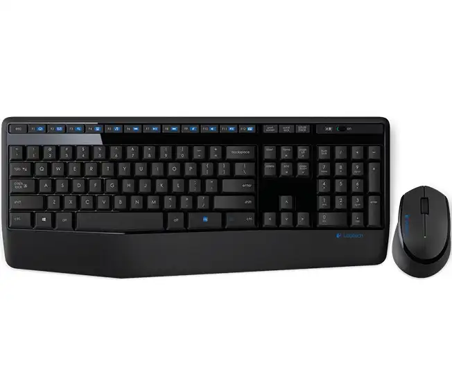 Logitech Combo MK345. Klaviatuuri kujutegur: Standard, Klaviatuuri stiil: Sirge, Ühenduvustehnoloogia: Juhtmevaba, Seadme liides: Raadioside, Klaviatuuri paigutus: QWERTY, Soovituslik kasutus: Universaalne. Toote värv: Must, Sinine. Hiir kaasa arvatud