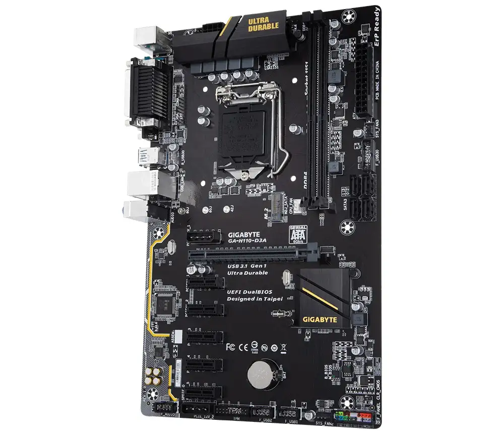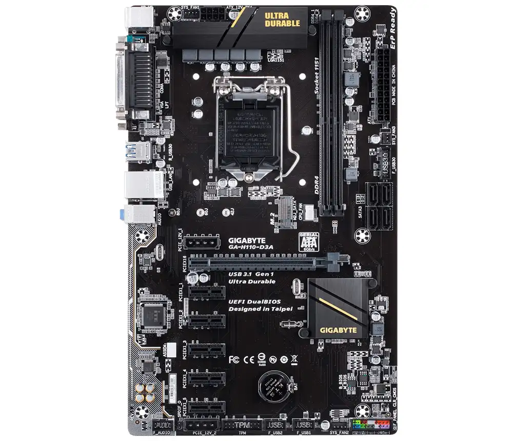 Gigabyte H110-D3A. Toetatud mälutüübid: DDR4-SDRAM, Mälupesa tüüp: DIMM, Toetatud mälu taktsagedused: 2133,2400 MHz. Protsessori tootja: Intel, Ühilduvad protsessoriseeriad: Intel® Celeron®, Intel® Pentium®, Protsessori pesa: LGA 1151 (pesa H4). Ethernet-liidese tüüp: Gigabit Ethernet. Komponent: PC, Emaplaadi kiibistik: Intel, Emaplaadi kiip: H110 Express. Maksimaalne graafikaadapteri mälu: 1000 MB, Graafikaadapter: HD Graphics, Graafikaadapteri perekond: Intel