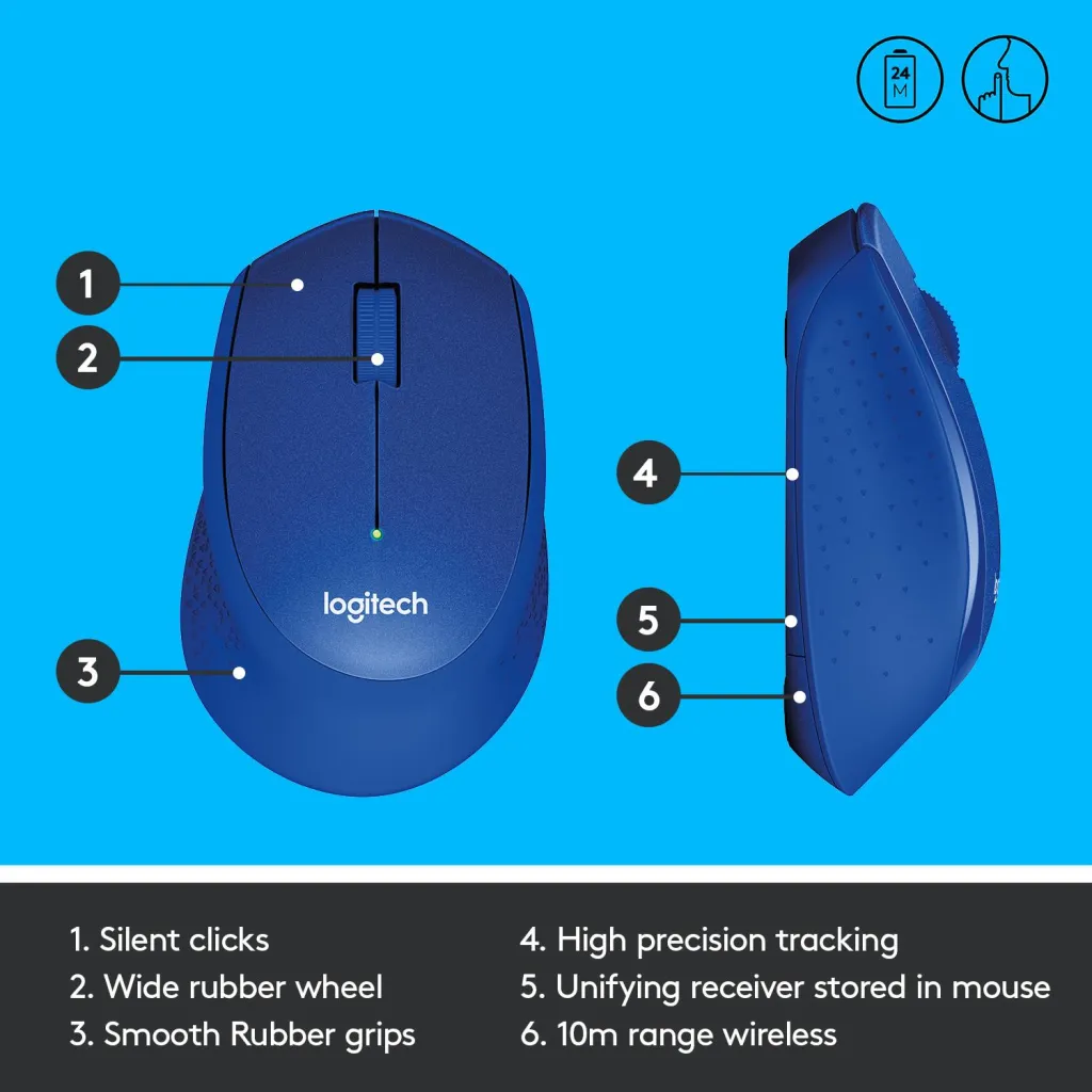 | Summary | Logitech M330 SILENT PLUS. Form factor: Right-hand. Movement detection technology: Optical, Device interface: RF Wireless, Movement resolution: 1000 DPI, Buttons type: Pressed buttons, Buttons quantity: 3, Scroll type: Wheel. Power source: Batteries. Product colour: Blue |