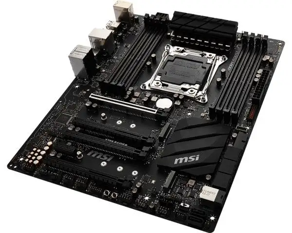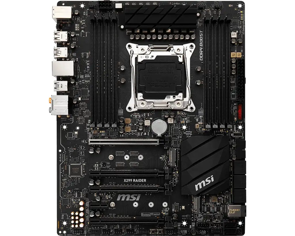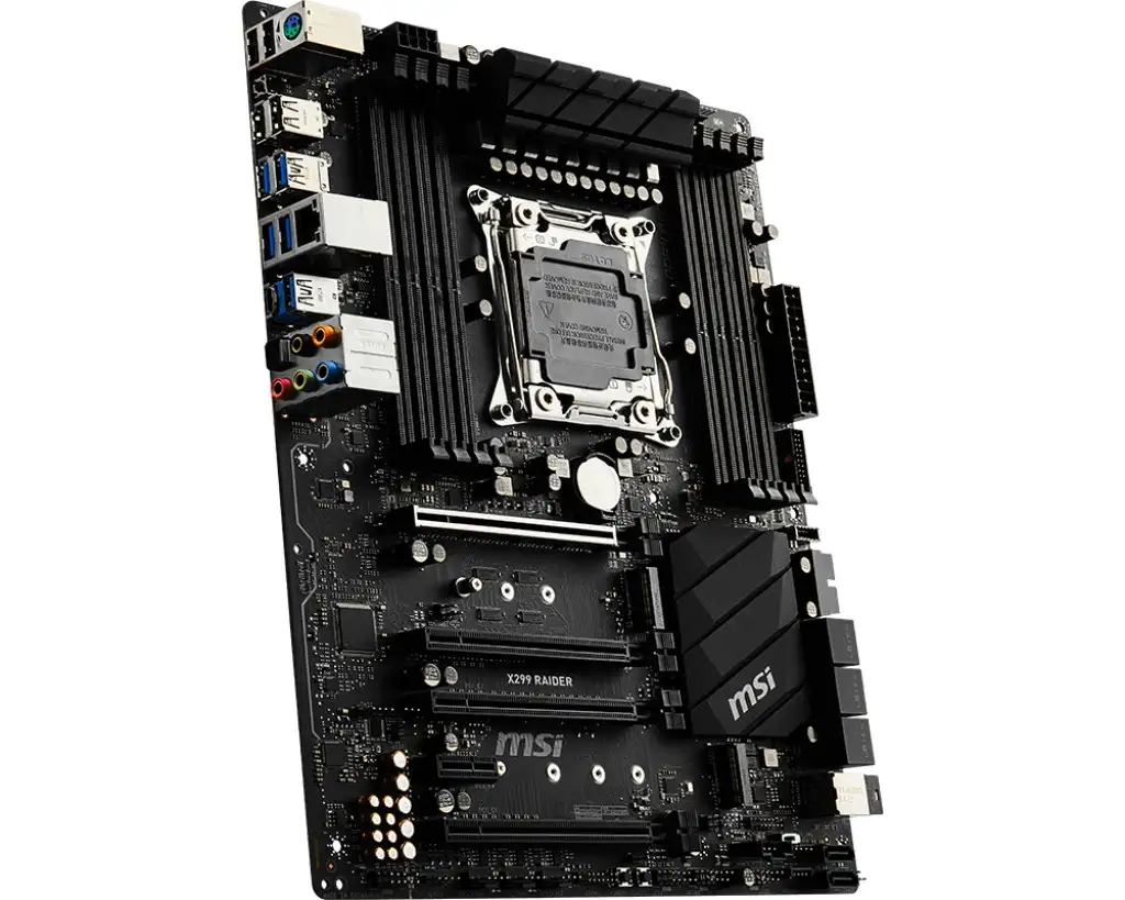 MSI X299 RAIDER. Protsessori tootja: Intel, Protsessori pesa: LGA 2066, Ühilduvad protsessoriseeriad: Intel Core i7,Intel Core i7 Extreme Edition. Toetatud mälutüübid: DDR4-SDRAM, Mälupesa tüüp: DIMM, Toetatud mälu taktsagedused: 2133,2400,2667,2800,2933,3000,3200,3333,3400,3466,3600,3733,3800,3866,4000,4133,4200,4266,4400,4500. Rööptöötlustehnoloogia tugi: 2-Way SLI,CrossFire. Ethernet-liidese tüüp: Gigabit Ethernet, LAN-kontroller: Intel® I219-V. Komponent: PC, Emaplaadi kujutegur: ATX, Emaplaadi kiibistik: Intel