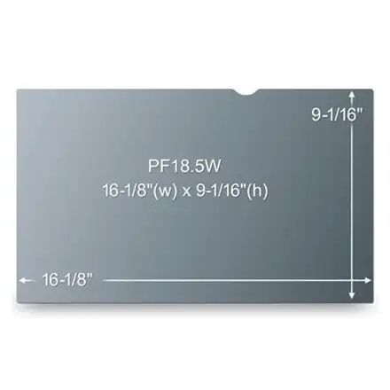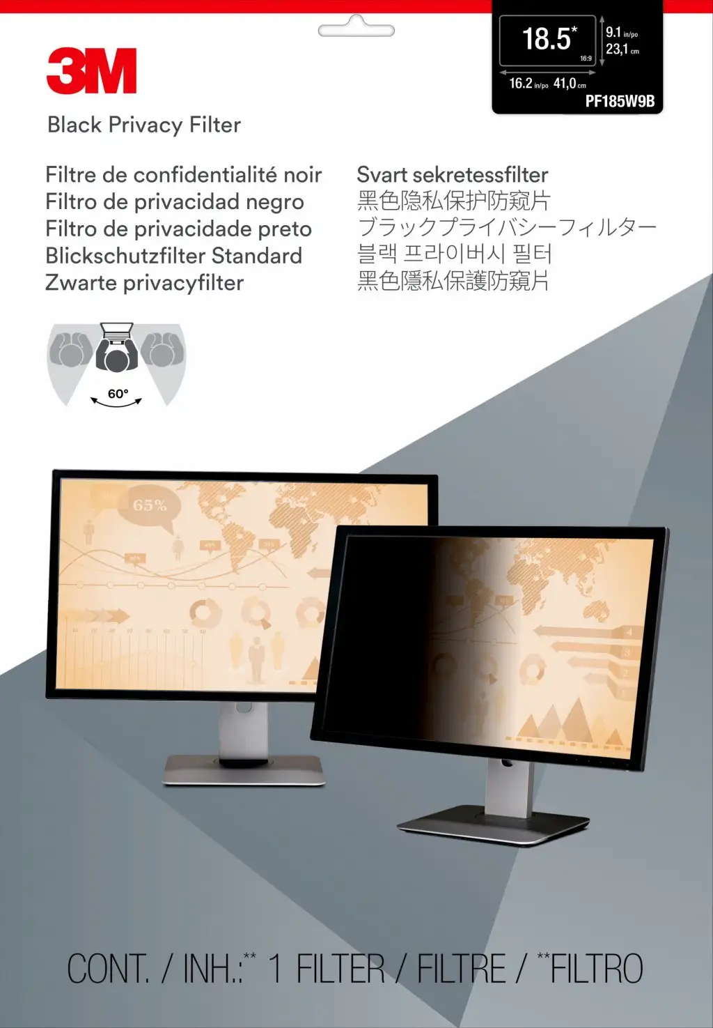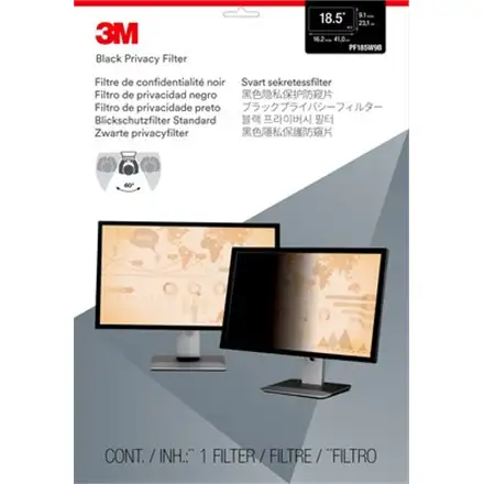 3M PF185W9B. Sobilik: Monitor, Tüüp: Raamideta ekraani privaatsusfilter, Filtri värv: Must. Ekraanifiltri omadused: Peegeldusvastane, Privaatsus, Kuvasuhe: 16:9, Kaitseomadused: Kriimustuskindel. Maksimaalne ekraanisuuruse sobivus: 47 cm (18.5"). Laius: 410 mm, Kõrgus: 231 mm