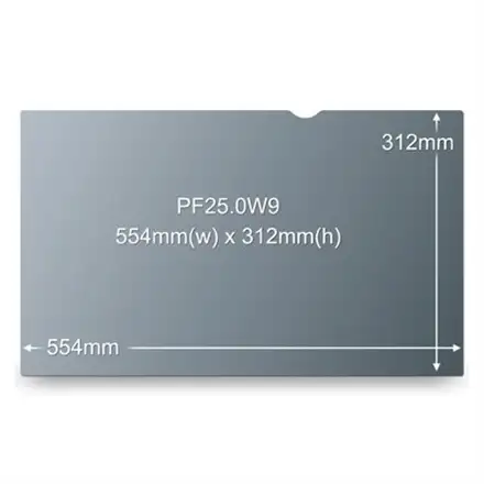 3M PF250W9B. Sobilik: Monitor, Tüüp: Raamideta ekraani privaatsusfilter, Filtri värv: Must. Ekraanifiltri omadused: Peegeldusvastane, Toetatud ekraanitüübid: LCD, Kuvasuhe: 16:9. Maksimaalne ekraanisuuruse sobivus: 63,5 cm (25"), Ekraani suurus k x l: 312 x 554 mm. Pakendi laius: 508 mm, Pakendi sügavus: 6 mm, Pakendi kõrgus: 685 mm. Kaubaaluse laius: 106 cm, Kaubaaluse pikkus: 121 cm, Kaubaaluse kõrgus: 118 cm