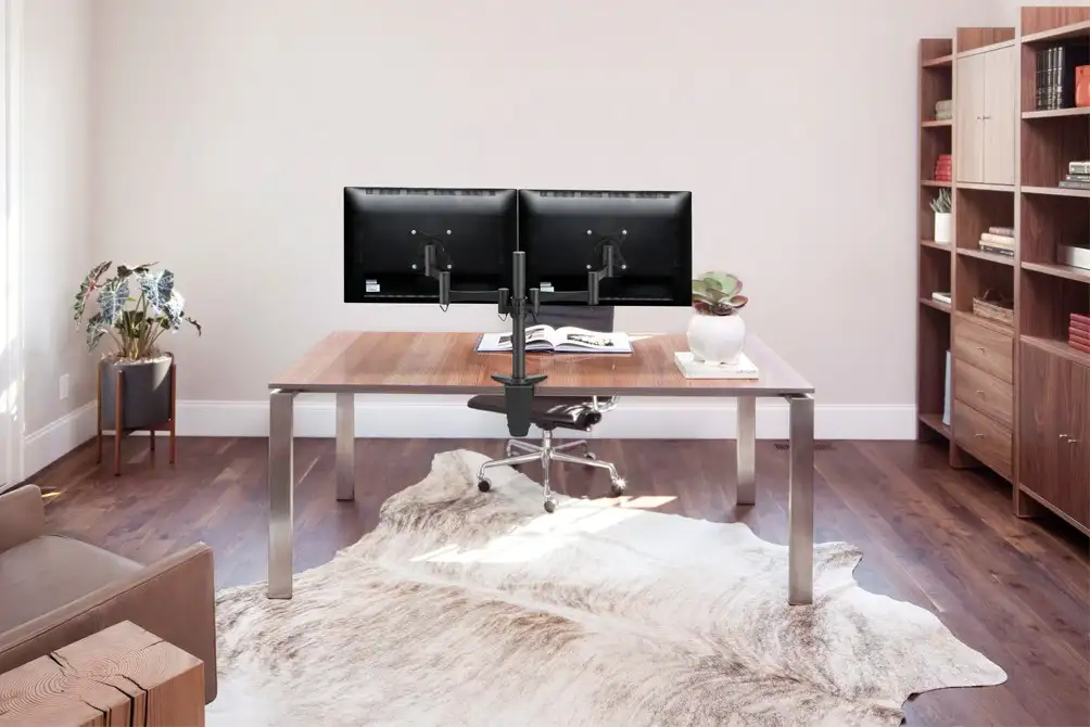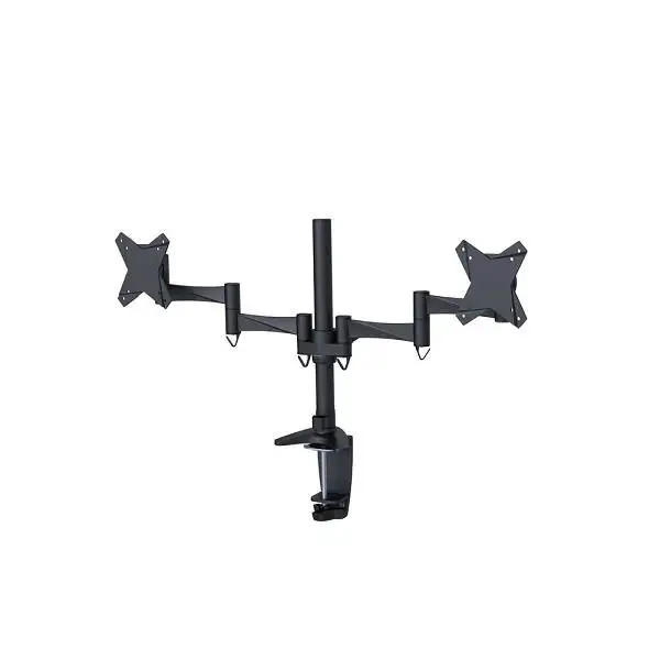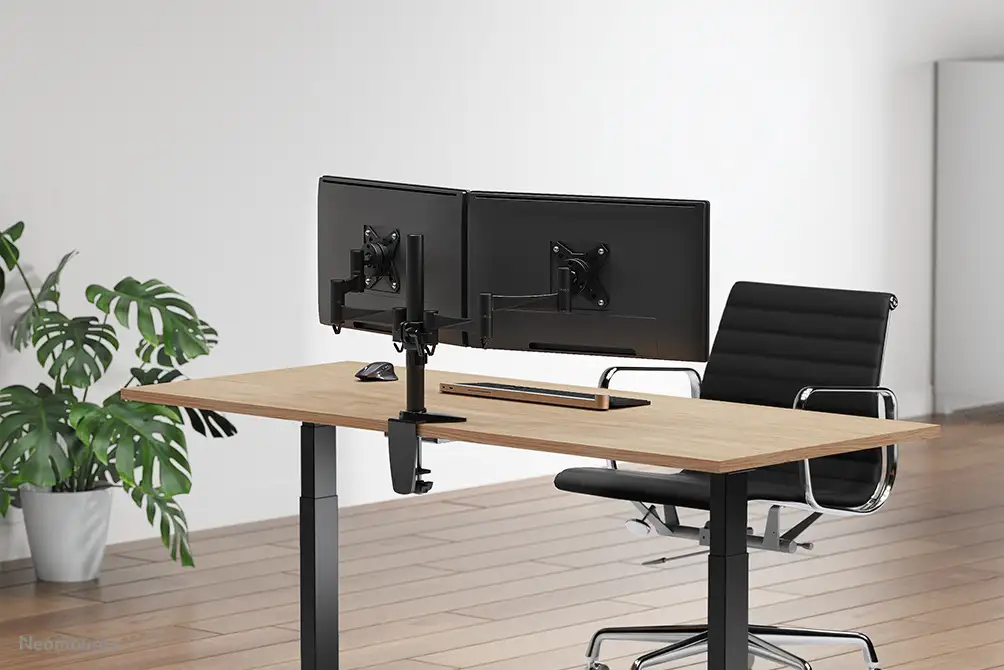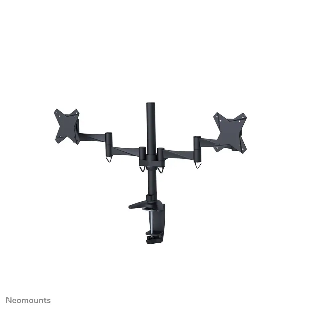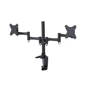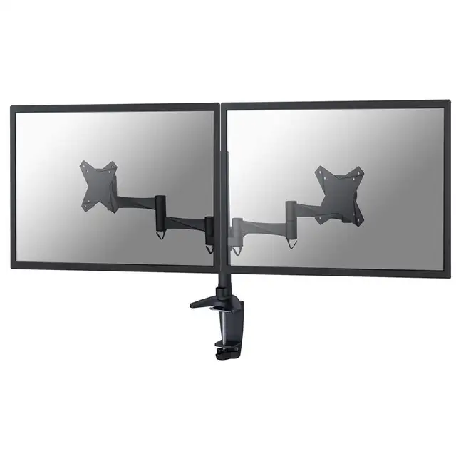 The NewStar desk mount, model FPMA-D1330DBLACK is a tilt-, swivel and rotatable desk mount for 2 flat screens up to 24”. This mount is a great choice for space saving placement on desks using a desk clamp or grommet mount.