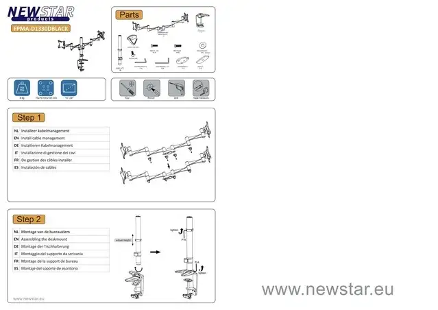 NewStar FPMA-D1330DBLACK has three pivot points and is suitable for screens up to 24" (60 cm). The weight capacity of this product is 9 kg each screen. The desk mount is suitable for screens that meet VESA hole pattern 75x75 or 100x100mm. Different hole patterns can be covered using NewStar VESA adapter plates.