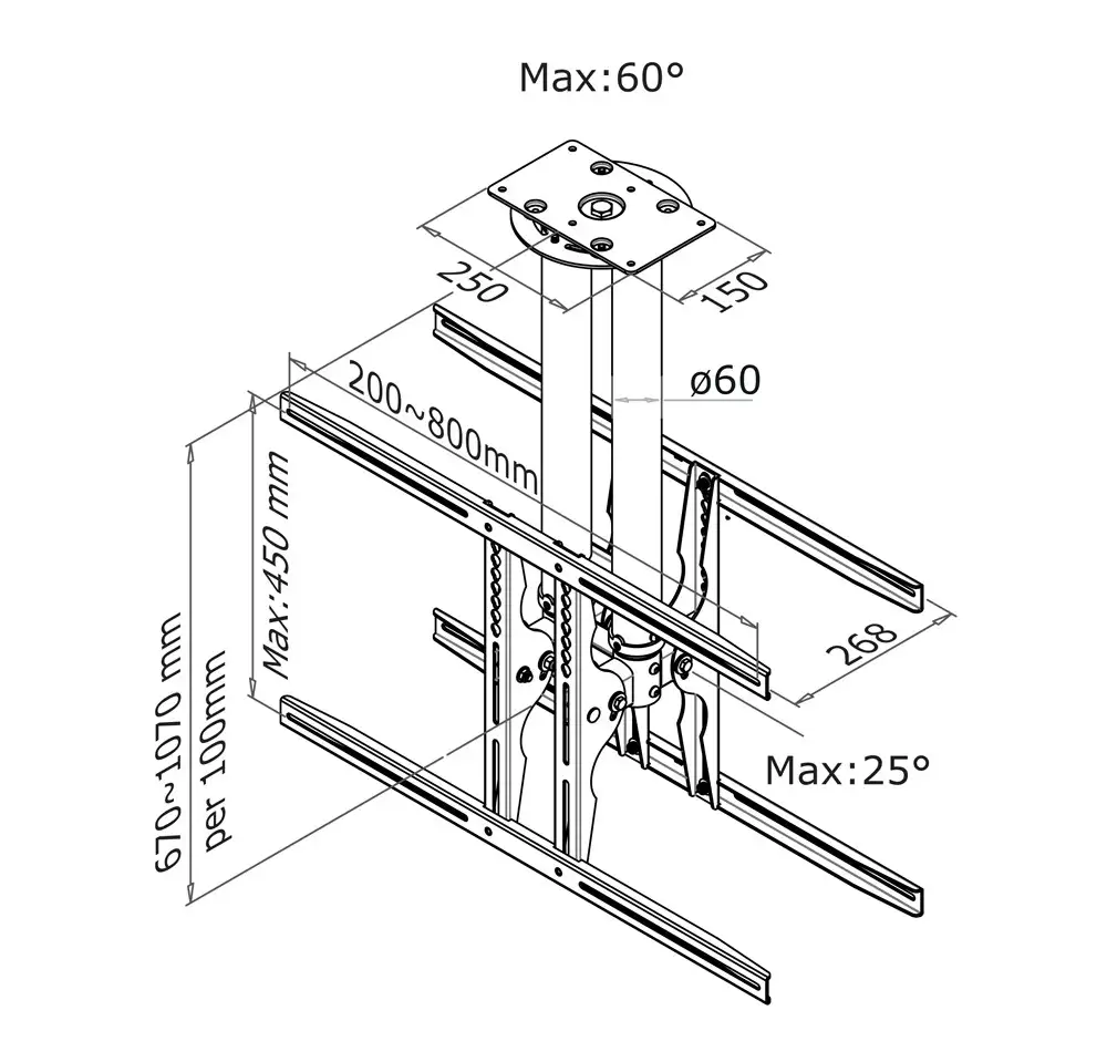 NewStars’ unique tilt (25°) and swivel (60°) technology allows the mount to change to any viewing angle to fully benefit from the capabilities of the flat screen. The support is easily height adjustable from 67 to 107 centimeters. If different heights are needed extension poles are available. A unique cable management conceals and routes cables from ceiling to TV. Hide your cables in the column to keep it nice and tidy.