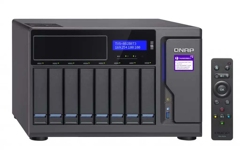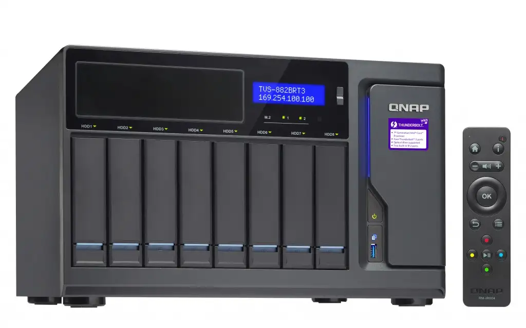 QNAP TVS-882BRT3. Toetatud ketaste tüübid: HDD,SSD, Ketta liides: M.2, Jada ATA II, Jada ATA III, Ketta suurus: 2.5/3.5". Protsessori perekond: 7th gen Intel® Core™ i5, Protsessori mudel: i5-7500, Protsessori sagedus: 3,4 GHz. Sisemälu: 16 GB, Sisemälu tüüp: DDR4, Mälu taktsagedus: 2133 MHz. Ethernet LAN-i andmeedastuskiirused: 10,100,1000 Mbit/s, Toetatud võrguprotokollid: CIFS/SMB, AFP (v3.3), NFS(v3), FTP, FTPS, SFTP, TFTP, HTTP(S), Telnet, SSH, iSCSI, SNMP, SMTP, SMSC. HDMI-versioon: 1.4b