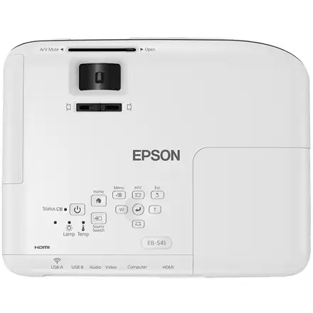 Epson EB-S41. Projektori heledus: 3300 ANSI luumenit, Projektsioonitehnoloogia: 3LCD, Projektori loomulik resolutsioon: SVGA (800x600). Lambi tööiga: 6000 h, Pirni võimsus: 210 W, Lambi tüüp: UHE. Fookus: Manuaal, Fikseeritud fookuskaugus: 1,67 cm, Apertuuriulatus (F-F): 1,44 - 1,44. Video töötlemine: 10 bitti, Värvirežiim (2D): Kino, Dünaamiline, Video värvirežiimid: Kino, Dünaamiline, Esitlus, sRGB. HDMI-pistiku tüüp: Täissuurus
