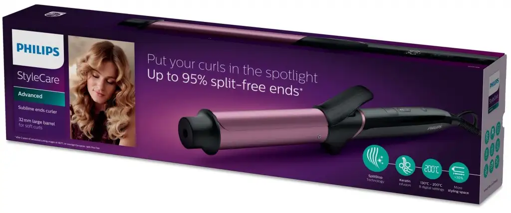 Philips 32 mm suur rull Koolutaja Sublime Ends, StyleCare. Tüüp: Lokitangid, Tehnoloogia: Soe, Temperatuur (min): 130 °C. Toote värv: Must, Lilla. Juhtme pikkus: 1,8 m. Silindri läbimõõt: 3,2 cm