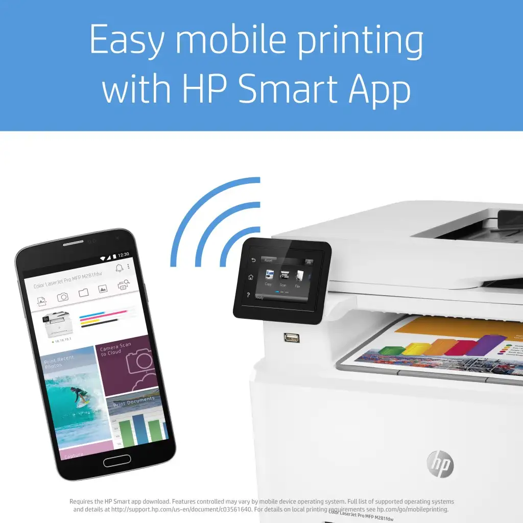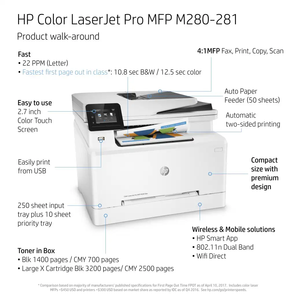 HP Color LaserJet Pro M281fdw. Printimistehnoloogia: Laser, Printimine: Värviline printimine. Maksimaalne resolutsioon: 600 x 600 DPI, Printimiskiirus (värviline, tavakvaliteet, A4/US Letter-formaat): 21 lk/min. Kopeerimine: Värviline kopeerimine. Maksimaalne kopeerimisresolutsioon: 600 x 600 DPI. Skaneerimine: Värviskaneerimine. Optilise skaneerimise resolutsioon: 1200 x 1200 DPI. Maksimaalne ISO A-seeria paberi suurus: A4. Standardne sisestusvõimsus: 250 lehte, Standardne väljundvõimsus: 100 lehte. WiFi. Otseprintimine. Toote värv: Valge