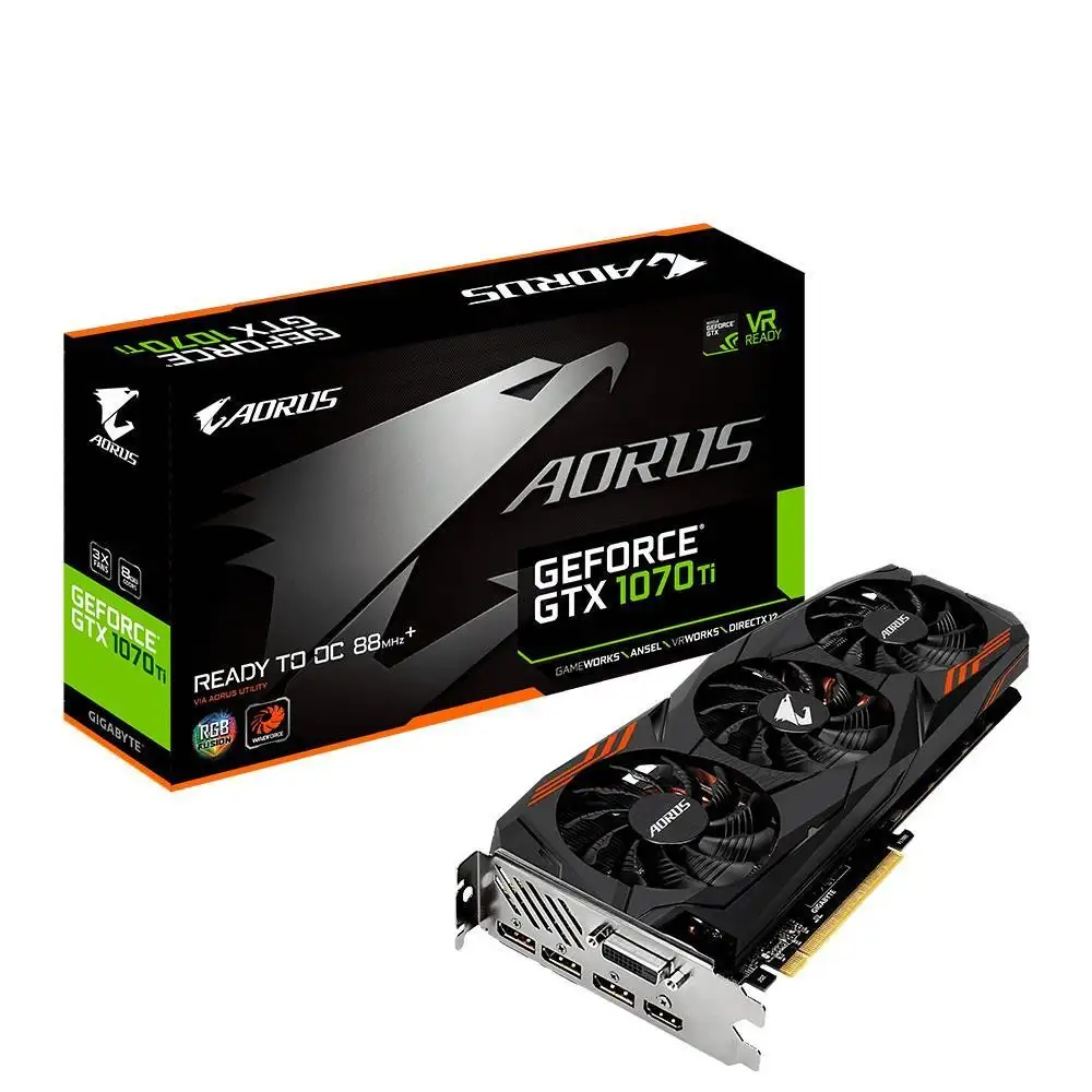 Gigabyte AORUS GeForce GTX 1070Ti 8G. Graafikaprotsessorite pere: NVIDIA, Graafikaprotsessor: GeForce GTX 1070 Ti, Protsessori sagedus: 1683 MHz. Eraldiseisva graafikakaardi mälu: 8 GB, Graafikaadapteri mälutüüp: GDDR5, Mälusiin: 256 bitti, Mälu taktsagedus: 8008 MHz. Maksimaalne resolutsioon: 7680 x 4320 pikslit. DirectX-i versioon: 12.0, OpenGL-i versioon: 4.5, Dual Link DVI. Jahutuse tüüp: Aktiivne, Ventilaatorite arv: 3 ventilaator(id), Valgustuse värv: Multi