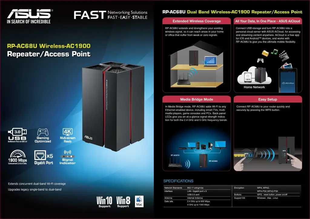 ASUS RP-AC68U. Wi-Fi laineala: Kaks sagedusala (2,4 GHz / 5 GHz), Wi-Fi standard: Wi-Fi 5 (802.11ac), WLAN edastuskiirus (max): 1300 Mbit/s. Ethernet LAN-liidese tüüp: Gigabit Ethernet, Ethernet LAN-i andmeedastuskiirused: 10,100,1000 Mbit/s, Kaabeldustehnoloogia: 10/100/1000Base-T(X). Turvaalgoritmid: WPA,WPA-EAP,WPA-PSK,WPA2,WPA2-EAP,WPA2-PSK,WPS. Toote värv: Must, Punane, LED-indikaatorid: WLAN. Toiteallika tüüp: Vahelduvvool, AC-sisendpinge: 110 - 240 V, AC-sisendsagedus: 50 - 60 Hz