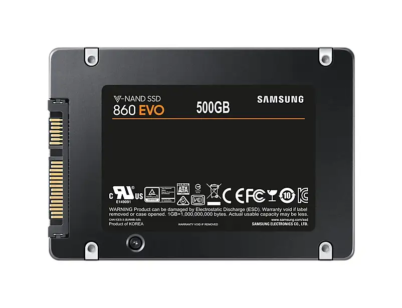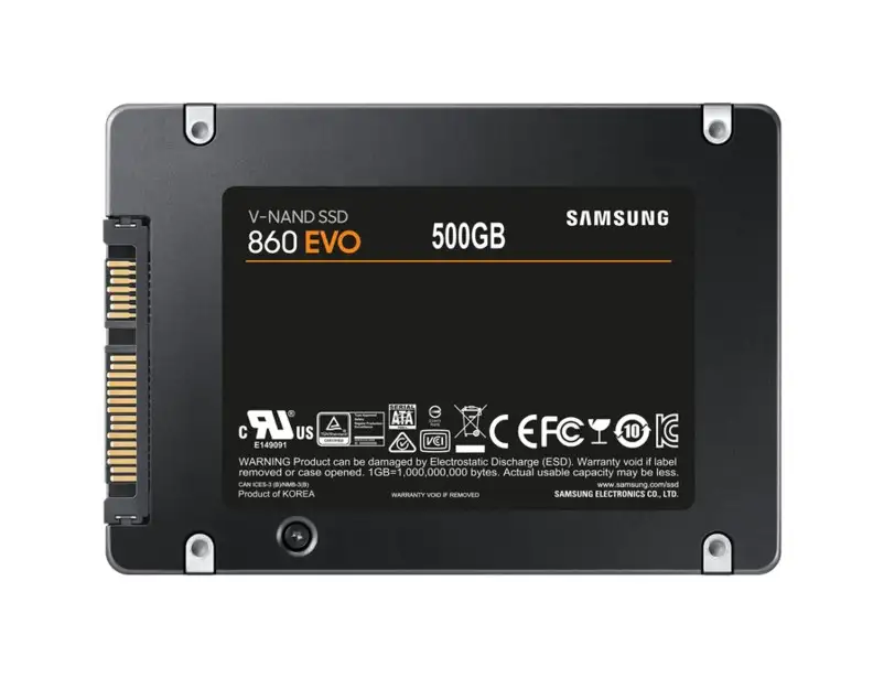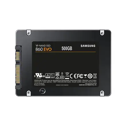 Samsung 860 EVO. Pooljuhtketta maht: 500 GB, SSD-ketta mõõtmed: 2.5", Lugemise kiirus: 550 MB/s, Kirjutamise kiirus: 520 MB/s, Andmeedastuskiirus: 6 Gbit/s, Komponent: PC/sülearvuti