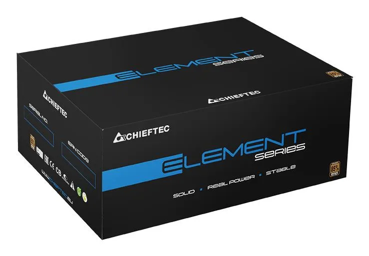 The brand new ELEMENT series combines innovation, high quality, great design and efficiency. With a silent running 12cm fan, the PSU is held in decent black, equipped with long native cables, a power cord, and a solid and eye catching retail box. With an efficiency of over 85% (BRONZE) @230V, the ELEMENT series fulfills the requirement of GREEN IT at an attractive price.