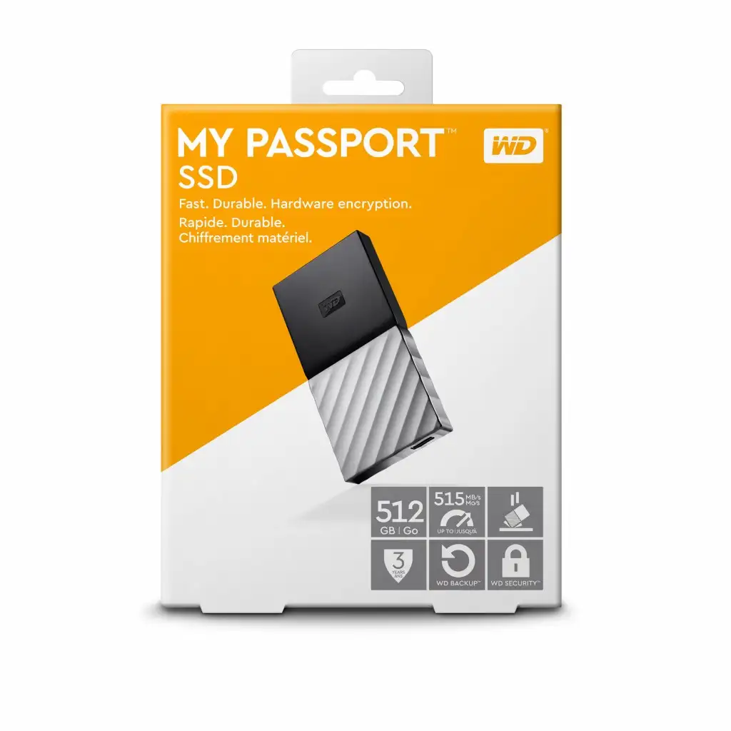 Western Digital My Passport. Pooljuhtketta maht: 512 GB. USB-konnektor: USB tüüp-C, USB versioon: 3.1 (3.1 Gen 2). Lugemise kiirus: 515 MB/s, Salasõna kaitse. Toote värv: Must, Hõbe