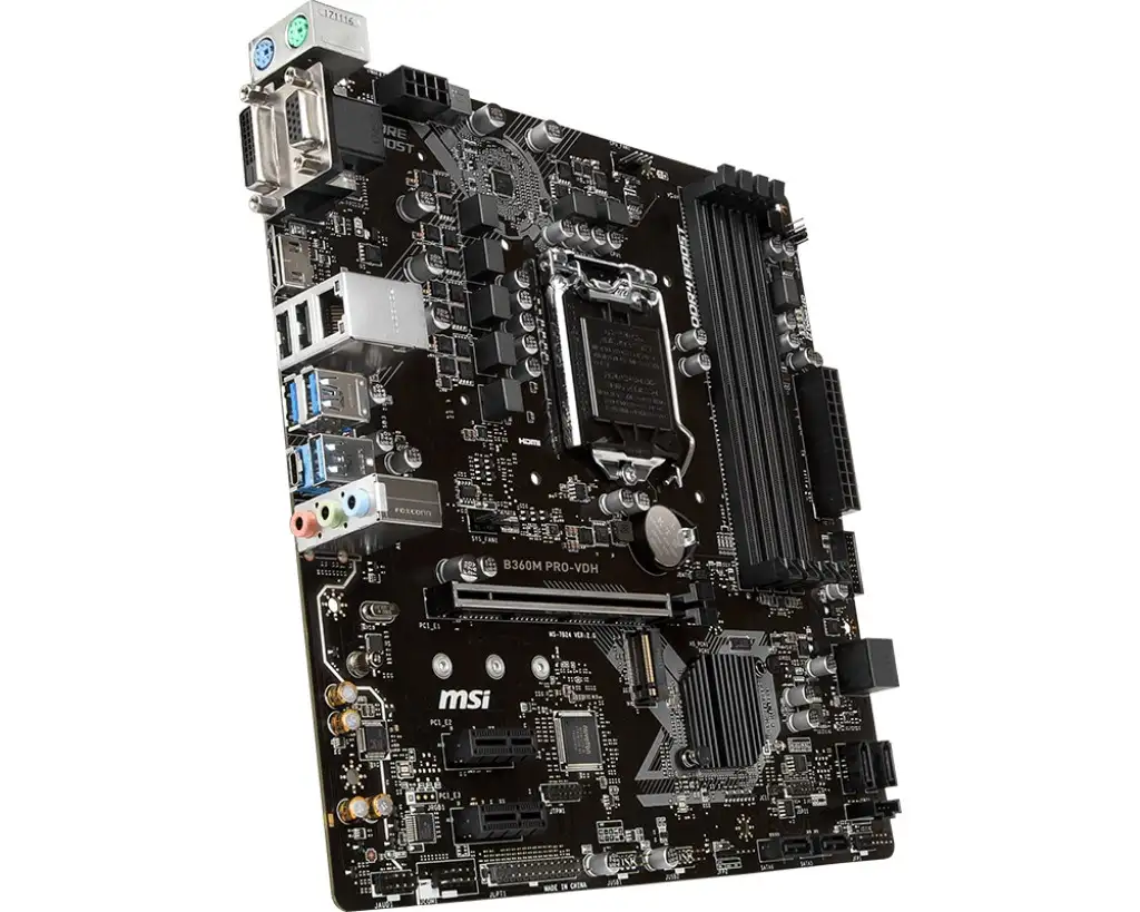 MSI B360M PRO-VDH. Protsessori tootja: Intel, Protsessori pesa: LGA 1151 (pesa H4), Ühilduvad protsessoriseeriad: Intel® Celeron®, Intel® Core™ i3, Intel Core i5, Intel Core i7, Intel® Pentium®. Toetatud mälutüübid: DDR4-SDRAM, Mälupesa tüüp: DIMM, Toetatud mälu taktsagedused: 2133,2400,2666 MHz. Kõvaketta ühenduse tüüp: M.2, Jada ATA III. Graafikaadapteri perekond: Intel, Maksimaalne resolutsioon: 4096 x 2160 pikslit. Ethernet-liidese tüüp: Gigabit Ethernet, LAN-kontroller: Realtek RTL8111H