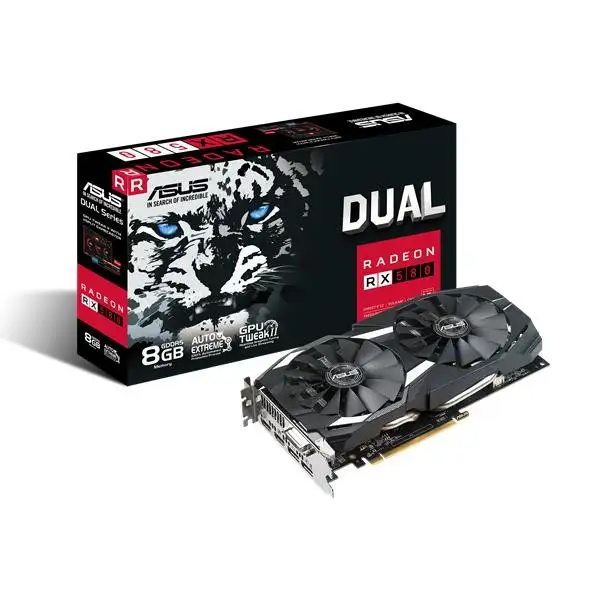 ASUS DUAL-RX580-8G. Graafikaprotsessorite pere: AMD, Graafikaprotsessor: Radeon RX 580, Protsessori sagedus: 1340 MHz. Eraldiseisva graafikakaardi mälu: 8 GB, Graafikaadapteri mälutüüp: GDDR5, Mälusiin: 256 bitti, Mälu taktsagedus: 8000 MHz. Maksimaalne resolutsioon: 7680 x 4320 pikslit. DirectX-i versioon: 12.0, OpenGL-i versioon: 4.5. Liidese tüüp: PCI Express 3.0. Jahutuse tüüp: Aktiivne, Ventilaatorite arv: 2 ventilaator(id)