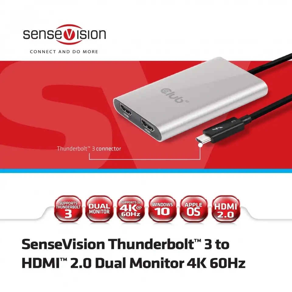CLUB3D Thunderbolt 3 to Dual HDMI 2.0 Adapter. Videopordi tüüp: USB tüüp-C, Videoväljund: 2x HDMI, Pistmik(ud): HDMI 2.0. Maksimaalne resolutsioon: 3840 x 2160 pikslit, Toote värv: Hall, Hõbe, Maksimaalne värskendussagedus: 60 Hz. Võimsustarve (tüüpiline): 15 W. Mõõdud (l x s x k): 93 x 56 x 16 mm, Kaal: 91 g. Pakendi pikkus: 28 cm, Pakendi laius: 80 mm, Pakendi sügavus: 35 mm