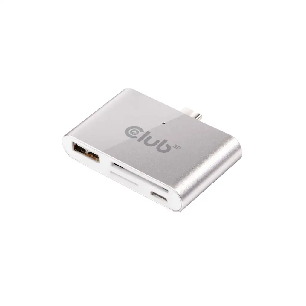 CLUB3D USB C Smart Reader. Ühenduvustehnoloogia: Dokkimine, Hostiliides: USB 3.2 Gen 1 (3.1 Gen 1) Type-C. Toote värv: Alumiinium, Hõbe, Valge, Ühilduvad mälukaardid: MicroSD (TransFlash),SD, Korpuse materjal: Alumiinium, Plast. Laius: 53 mm, Sügavus: 38 mm, Kõrgus: 11 mm. Pakendi laius: 75 mm, Pakendi sügavus: 75 mm, Pakendi kõrgus: 22 mm. Ühilduvad operatsioonisüsteemid: All