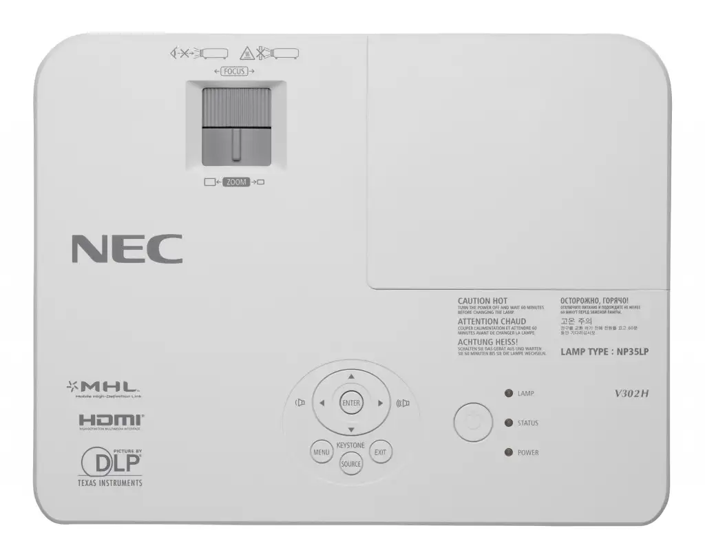 NEC V302H. Projektori heledus: 3000 ANSI luumenit, Projektsioonitehnoloogia: DLP, Projektori loomulik resolutsioon: 1080p (1920x1080). Lambi tööiga: 3500 h, Pirni võimsus: 218 W, Lambi tööiga (säästurežiim): 6000 h. Fookus: Manuaal, Kõrvalekalle: 66,4 protsenti, Projitseerimiskauguse suhe: 1.5 - 1.8:1. Analoogsignaali vormingu süsteem: NTSC,NTSC 4.43,PAL,PAL 60,PAL M,PAL N,SECAM, Toetatud graafikaresolutsioonid: 1920 x 1080 (HD 1080), Toetatud videorežiimid: 1080p. HDMI-pistiku tüüp: Täissuurus, USB-pistmiku tüüp: Mini-USB, Jadaliidese tüüp: RS-232