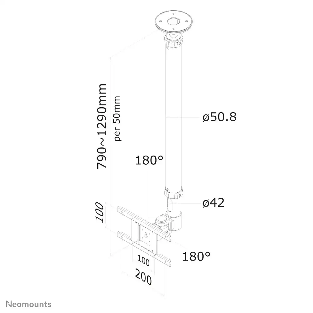 Neomounts by Newstar FPMA-C100. Maksimaalne kaal (mahutavus): 12 kg, Ekraani minimaalne suurus: 25,4 cm (10"), Ekraani maksimaalne suurus: 76,2 cm (30"), Paigaldussüsteemi ühilduvus (min): 75 x 75 mm, Paigaldussüsteemi ühilduvus (max): 200 x 100 mm. Kõrguse reguleerimise ulatus: 790 - 1290 mm, Kaldenurk: 0 - 180°, Pöördenurk: 180°. Toote värv: Hõbe