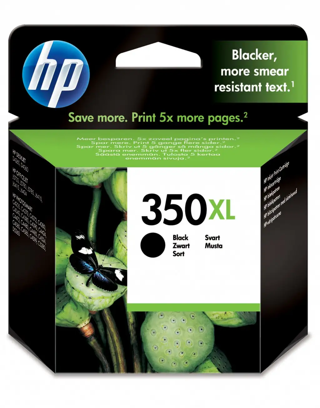 HP 350XL. Tüüp: Originaal, Tindi tüüp: Pigmendipõhine tint, Printimisvärvid: Fotomust. Kaal: 65 g, Pakendi tüüp: Vill. Kogus aluse kohta: 2160 tk, Kaubaaluse kaal: 221 kg. Leheküljetootluse lisamärkus: ISO/IEC 24711, Pakendi mõõtmed (l x s x k): 116 x 36 x 115 mm. Prindipea kaar: 1,27 cm (0.5"), Kogus karbi kohta: 1 tk