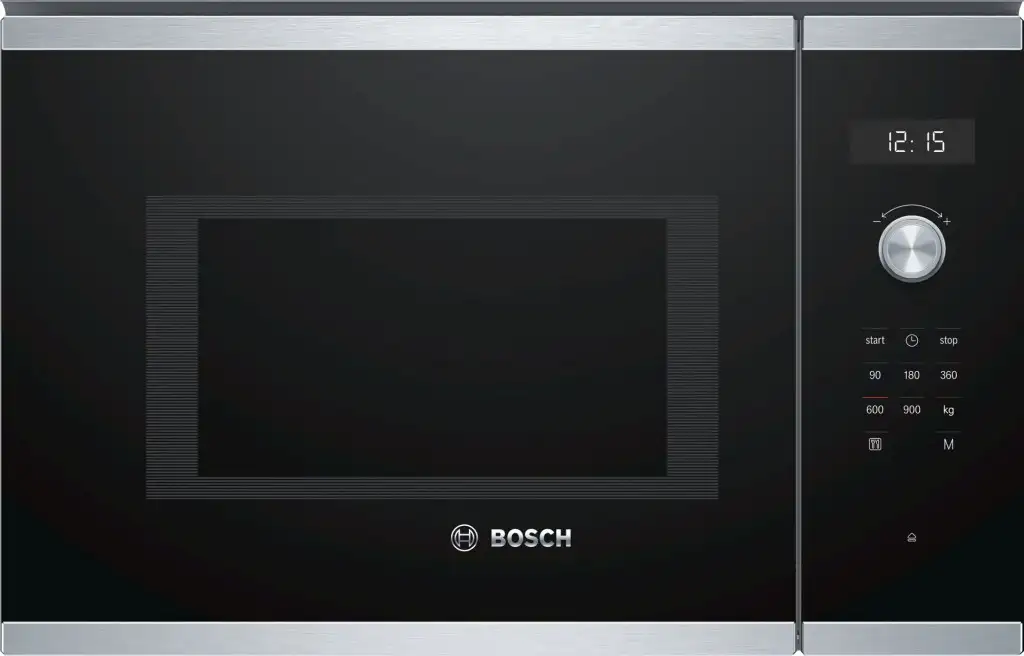 Bosch Serie 6 BFL554MS0. Seadme paigaldus: Sisseehitatud, Toote tüüp: Eraldiseisev mikrolaineahi, Sisemahutavus: 25 l, Mikrolainevõimsus: 900 W, Sisseehitatud ekraan, Kuvamise tüüp: LED, Kontrolli tüüp: Pöörlev, Puudutus, Toote värv: Must, Roostevaba teras