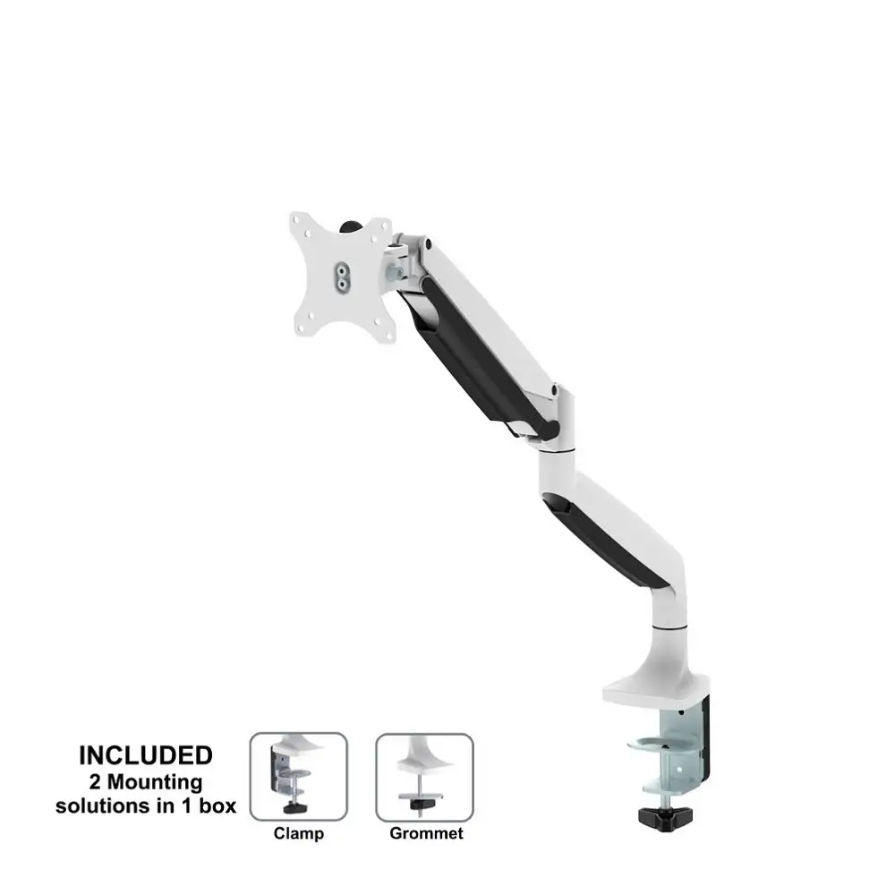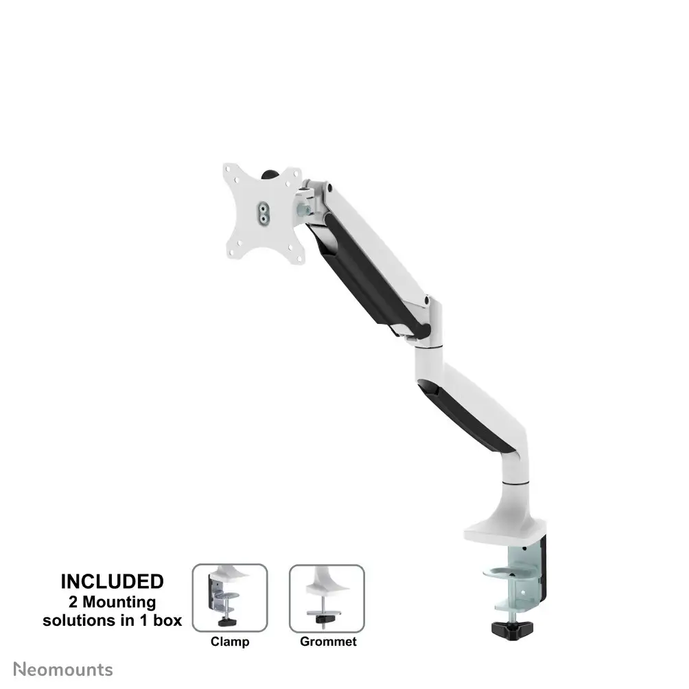 The Neomounts Select desk mount, model NM-D750WHITE is a tilt-, swivel and rotatable desk mount with gas spring for flat screens up to 32?. This mount is a great choice for space saving placement on desks using a desk clamp or grommet mount. Neomounts Selects? unique tilt (180°), rotate (180°) and swivel (360°) technology allows the mount to change to any viewing angle to fully benefit from the capabilities of the flat screen. The mount is easily height adjustable from 17 to 51 centimetres using a gas spring. Depth adjustable from 0 to 61 centimetres. A unique cable management conceals and routes cables from mount to flat screen. Hide your cables to keep the workplace nice and tidy. Neomounts Select NM-D750WHITE has three pivot points and is suitable for screens up to 32" (82 cm). The weight capacity of this product is 9 kg each screen. The desk mount is suitable for screens that meet VESA hole pattern 75x75 or 100x100mm. Different hole patterns can be covered using Neomounts Select VESA adapter plates. By using an ergonomic mount neck- and back complaints can be avoided. Ideal for use in offices and on counters or in a reception area. All installation material is included with the product.