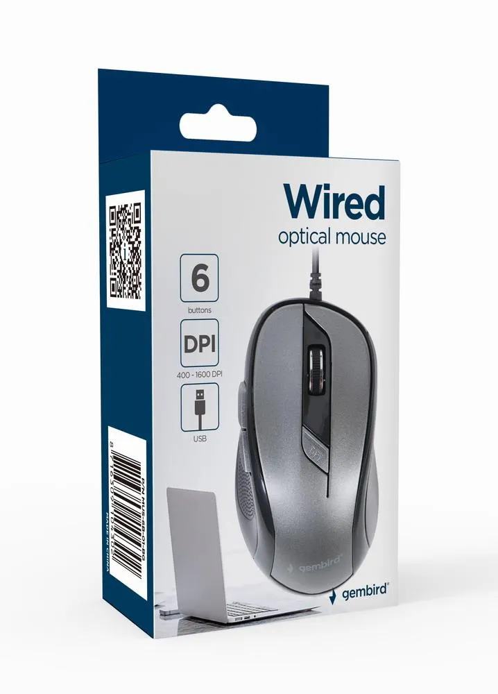 | Summary | Gembird MUS-6B-01-BG. Form factor: Right-hand. Movement detection technology: Optical, Device interface: USB Type-A, Movement resolution: 1600 DPI, Buttons type: Pressed buttons, Buttons quantity: 6, Scroll type: Wheel. Power source: Cable. Works on any surface. Product colour: Black, Grey |
