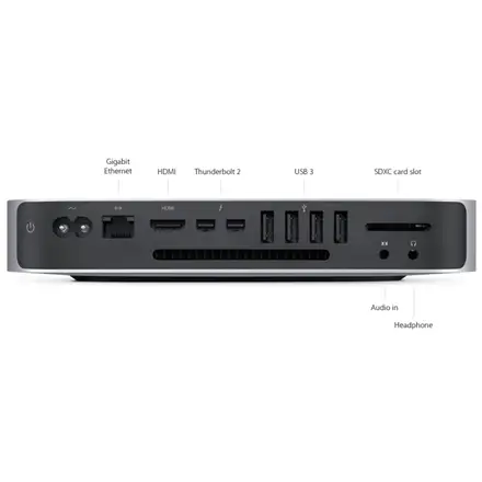 | Connections | Two Thunderbolt 2 ports (up to 20 Gbps) Four USB 3 ports (up to 5 Gbps) HDMI port SDXC card slot Gigabit Ethernet port Audio in port 3.5 mm headphone jack IR receiver |