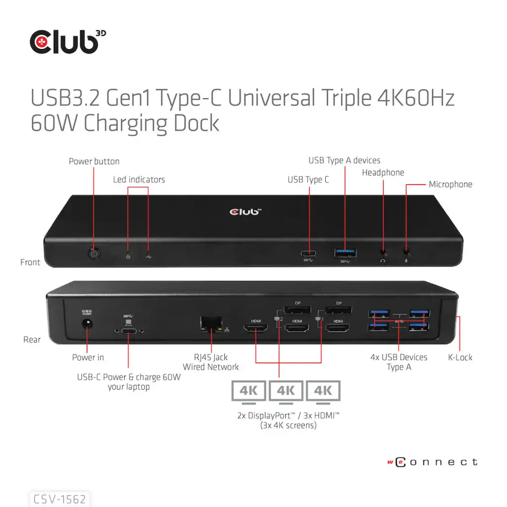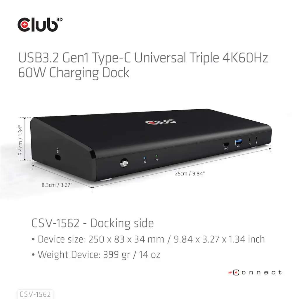 CLUB3D CSV-1562. Ühenduvustehnoloogia: Dokkimine, Hostiliides: USB 3.2 Gen 1 (3.1 Gen 1) Type-C, Kõrvaklappide ühenduvus: 3,5 mm. Toote värv: Must, LED-indikaatorid: Võimsus, Päritoluriik: Hiina. Toetatud Windowsi operatsioonisüsteemid: Windows 10, Windows 11. Laius: 250 mm, Sügavus: 83 mm, Kõrgus: 43 mm. Pakendi laius: 298 mm, Pakendi sügavus: 92 mm, Pakendi kõrgus: 150 mm
