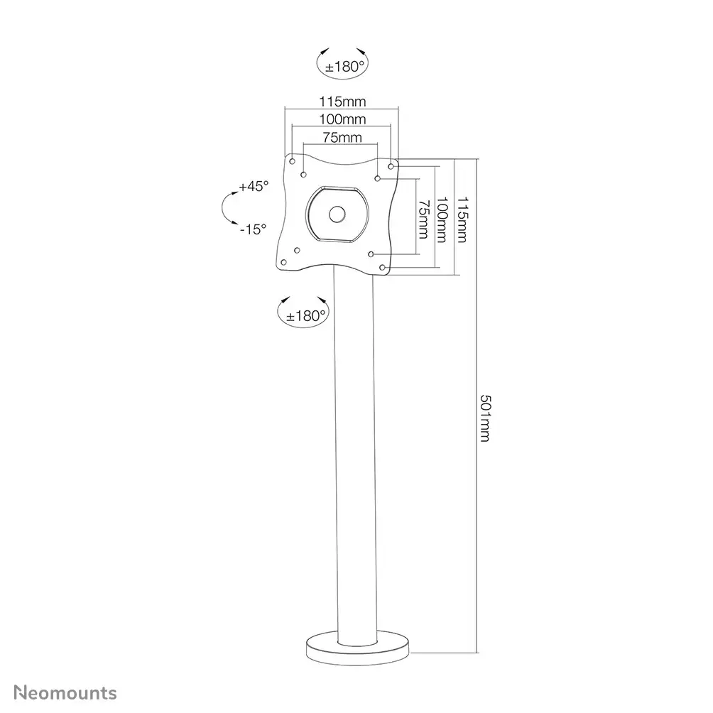 The Neomounts by Newstar desk mount, model NS-DPOS100BLACK is a tilt-, swivel and rotatable desk mount for flat screens up to 32?. This mount is a great choice for space saving placement on desks and counters using a bolt-down base. Neomounts by Newstar's versatile tilt (60°), rotate (360°) and swivel (360°) technology allows the mount to change to any viewing angle to fully benefit from the capabilities of the flat screen. An innovative cable management conceals and routes cables from mount to flat screen. Hide your cables to keep the workplace nice and tidy. Ideal for use in offices and on counters or in a reception area. Neomounts by Newstar NS-DPOS100BLACK is suitable for screens up to 32". The weight capacity of this product is 15 kg. The desk mount is suitable for screens that meet VESA hole pattern 75x75 or 100x100mm. Different hole patterns can be covered using Neomounts by Newstar VESA adapter plates. All installation material is included with the product.
