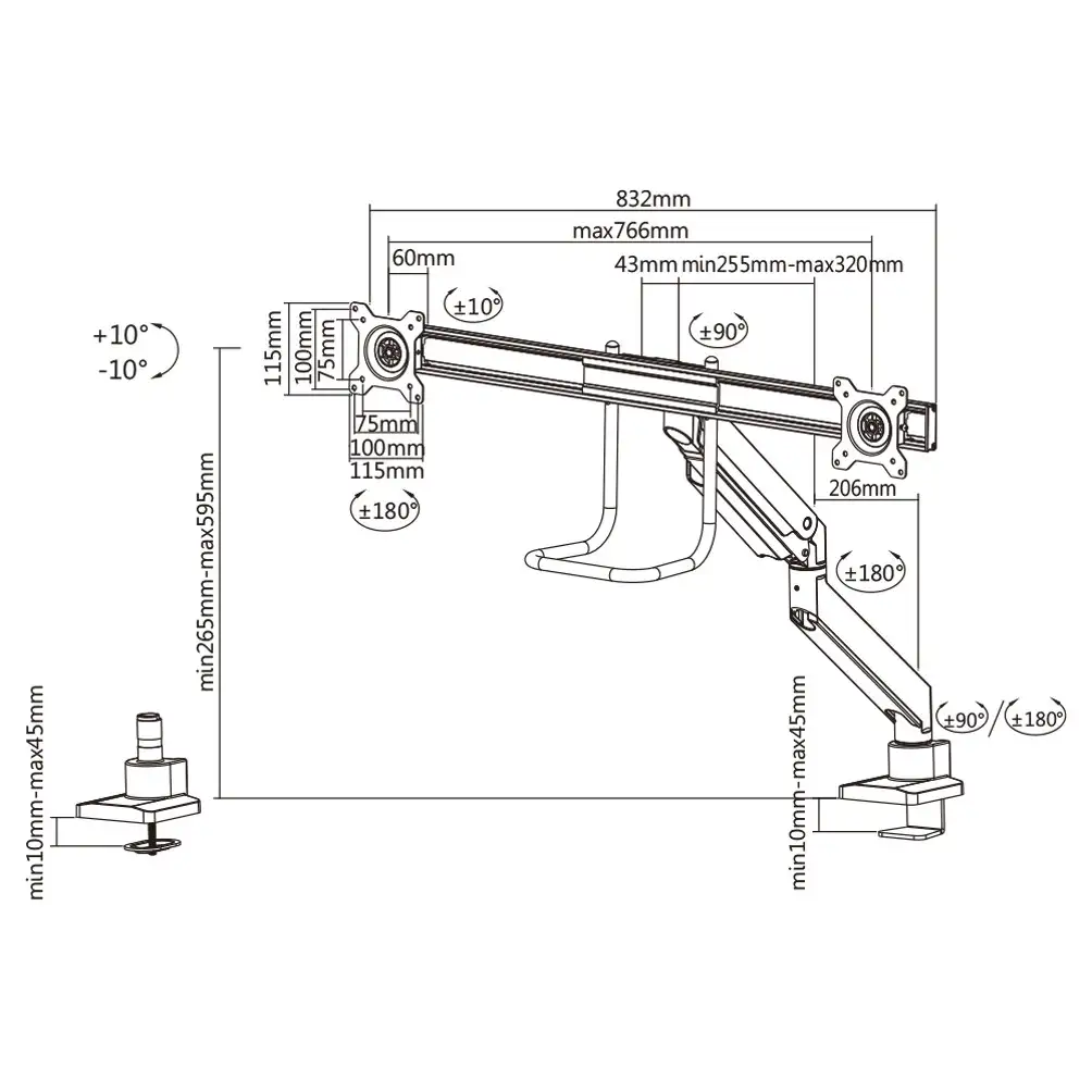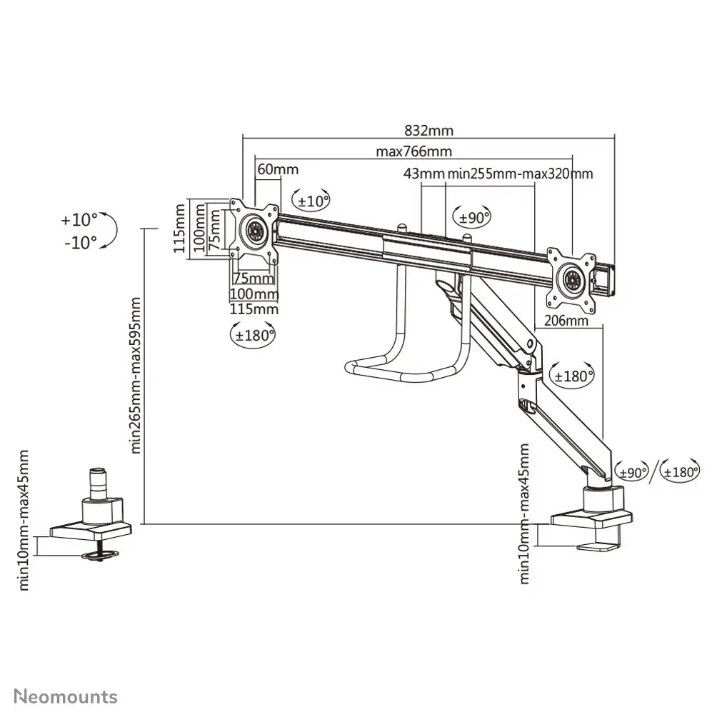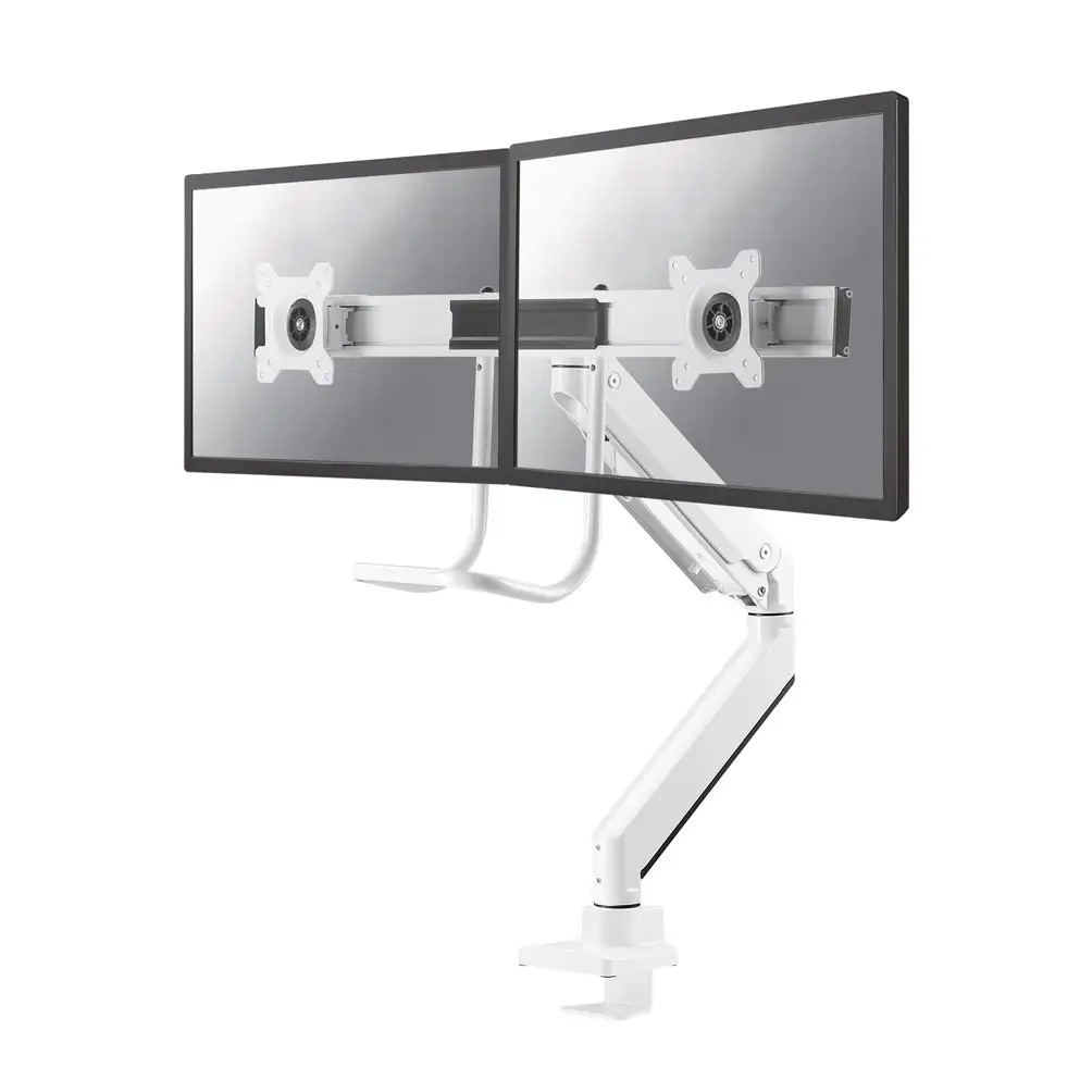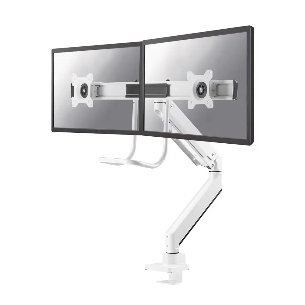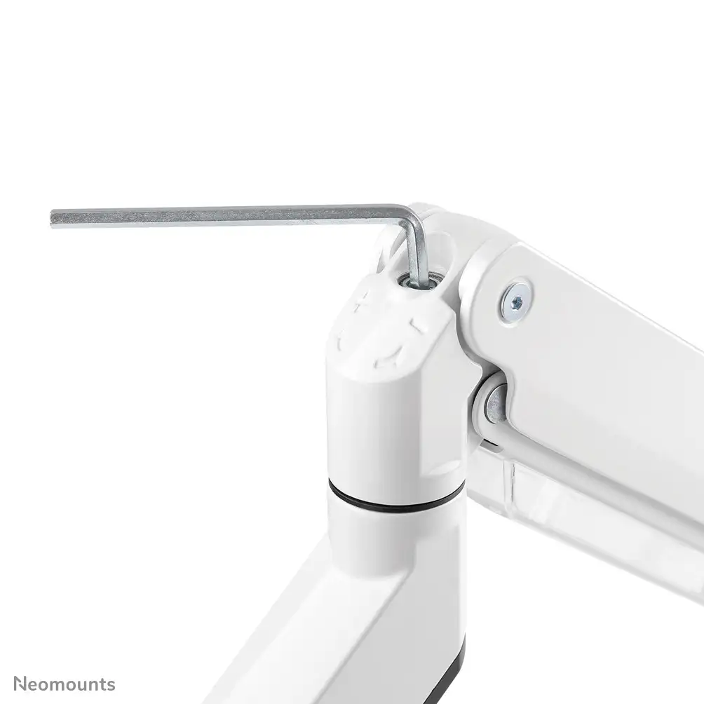 The Neomounts Select NM-D775DXWHITE is a tilt-, swivel and rotatable desk mount with crossbar and handle for 2 flat screens up to 32". This mount is a great choice for space saving placement on desks using a desk clamp or grommet mount. Neomounts Selects' unique tilt (20°), rotate (360°) and swivel (180°/360°) technology allows the mount to change to any viewing angle to fully benefit from the capabilities of the flat screen. The mount is easily individually height adjustable to 60 centimetres using a gas spring. Depth adjustable from 0 to 63 centimetres. A unique cable management conceals and routes cables from mount to flat screen. Hide your cables to keep the workplace nice and tidy. The mount is equipped with a 180° stop mechanism. Neomounts Select NM-D775DXWHITE with handle has three pivot points and is suitable for screens up to 32" (81 cm). The weight capacity of this product is 1 to 16 kg (max. 8 kg each screen). The desk mount is suitable for screens that meet VESA hole pattern 75x75 or 100x100mm. Different hole patterns can be covered using Neomounts Select VESA adapter plates. By using an ergonomic mount neck- and back complaints can be avoided. Ideal for use in offices and on counters or in a reception area. All installation material is included with the product.