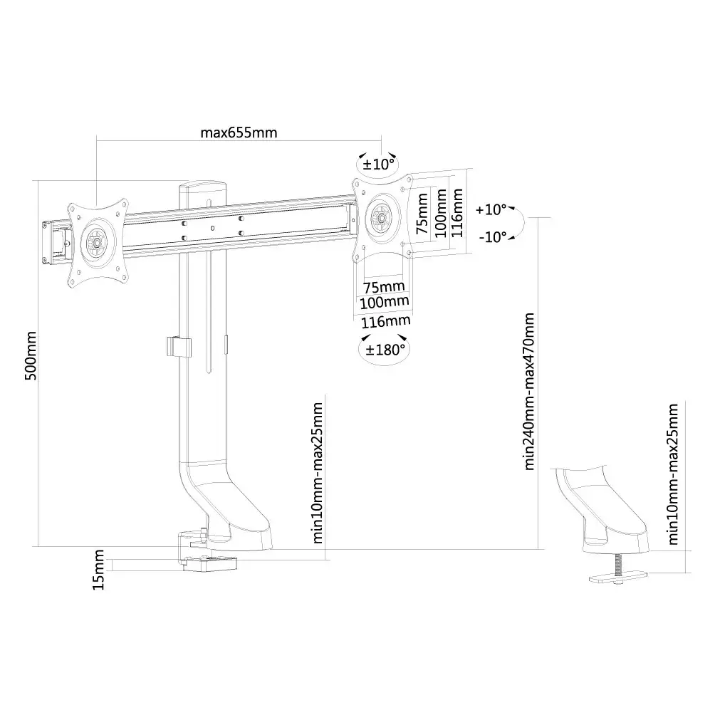 Neomounts FPMA-D860DBLACK. Paigaldus: Klamber/kaitsekrae, Maksimaalne kaal (mahutavus): 7 kg, Ekraani minimaalne suurus: 25,4 cm (10"), Ekraani maksimaalne suurus: 68,6 cm (27"), Paigaldussüsteemi ühilduvus (min): 75 x 75 mm, Paigaldussüsteemi ühilduvus (max): 100 x 100 mm. Kõrguse reguleerimine, Pöördenurga ulatus: -10 - 10°, Kaldenurk: -10 - 10°. Toote värv: Must