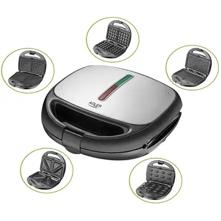 Functions | Sandwich maker from toasting bread (triangle pates). Thicker sandwiches maker from traditional bread (rectangular plates). Contact grill for two-sided grilling. Waffle maker. Nut cakes maker. |
