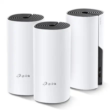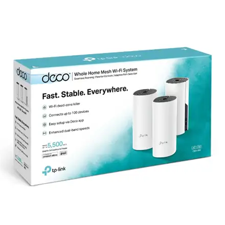 TP-Link Deco M4(3-pack). Toote värv: Valge, Antenni tüüp: Sisemodem, Toote tüüp: Võrgusüsteem. Wi-Fi laineala: Kaks sagedusala (2,4 GHz / 5 GHz), Wi-Fi standard: Wi-Fi 5 (802.11ac), WLAN edastuskiirus (max): 1167 Mbit/s. Tulemüür: SPI, Toetatud mobiilsed operatsioonisüsteemid: Android 4.4, Android 5.0, Android 5.1, Android 6.0, Android 7.0, Android 7.1, Android 7.1.2,.... AC-sisendpinge: 100 - 240 V, AC-sisendsagedus: 50 - 60 Hz, AC-adapteri väljundpinge: 12 V. Vastavussertifikaadid: RoHS, CE, Sertifikaat: FCC, IC, NCC, BSMI, IDA, RCM, JPA, JRF, VCCI, KC