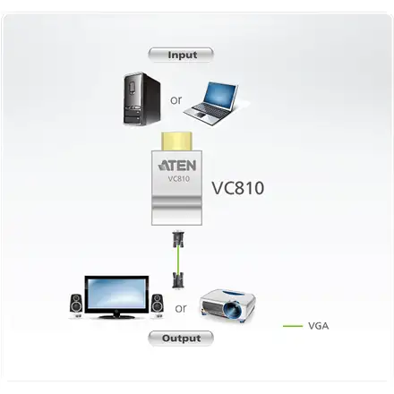 ATEN VC810-AT. Toote värv: Valge, Korpuse materjal: Plast. Maksimaalne video resolutsioon: 1920 x 1200 pikslit, Toetatud videorežiimid: 1080p. Hostiliides: HDMI, Väljundliides: VGA. Laius: 23 mm, Sügavus: 45,5 mm, Kõrgus: 14,8 mm. Pakendi laius: 125 mm, Pakendi sügavus: 180 mm, Pakendi kõrgus: 35 mm